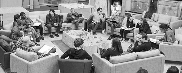Voici donc la première photo officielle publiée de Star Wars épisode VII. Il s’agit de la première réunion de l’ensemble du casting autour de J.J. Abrams. On peut ainsi identifier le réalisateur dans le fauteuil sombre en face de nous avec le scénario sur les genoux. A partir de lui (et dans le sens des aiguilles d’une montre, on peut identifier Harrison Ford, Daisy Ridley, Carrie Fisher, Peter Mayhew, le producteur Brian Burk, la productrice Kathleen Kennedy, Domnhall Gleeson, Anthony Daniels, Mark Hamill, Andy Serkis, Oscar Isaac, John Boyega, Adam Driver et enfin le scénariste Lawrence Kasdan.