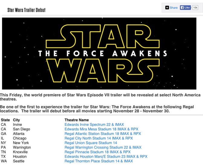 La chaîne Regal Cinemas vient d’annoncer sur son compte Twitter que la première bande-annonce du très attendu Star Wars : The Force Awakens sera projetée ce vendredi 28 novembre (et ceux jusqu’au 30 novembre) dans neuf cinémas américains, avant chaque séance.