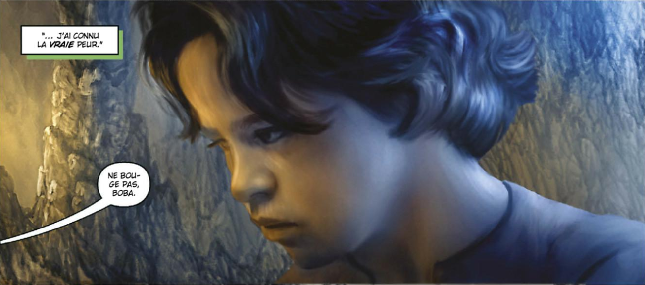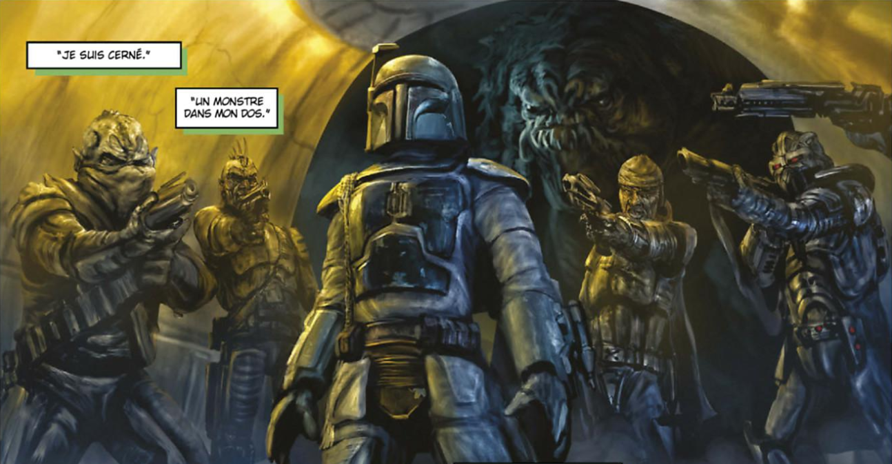 Le dessin est à l’image du thème : plutôt sombre, il n’est pas sans rappeler les décors de la Caste des Méta-barons, surtout quand démarre l’initiation du petit Boba, puis des personnages qui restent souvent dans l’ombre, attendant leur heure, loin de la lumière des sabres laser ou des combats de X-Wing. Une pointe de l’atmosphère des Misérables tombe même parfois sur cette ambiance de science-fiction, qui veut seulement montrer les coins un peu pourris de la galaxie. Petit astuce pour basculer à nouveau dans l’univers Star Wars, l’usage des différentes armes du chasseur de prime, amené à se sortir de situations difficiles, ponctuées de quelques phrases d’humour.