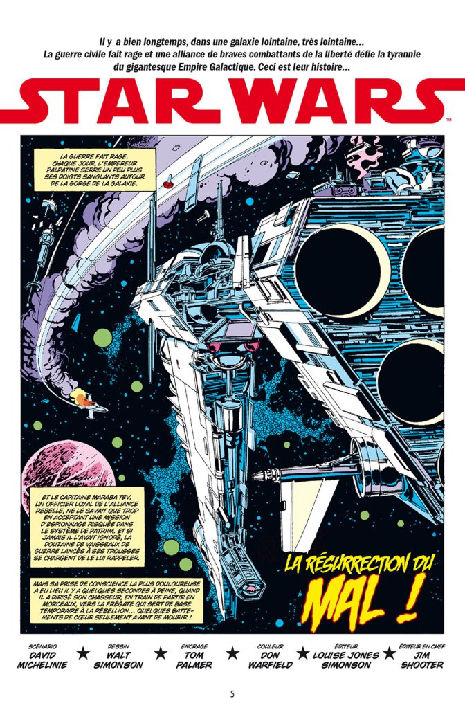 Le tome 5 est tout juste sorti, mais il a déjà presque quarante ans. Amateurs de vintage, approchez-vous, c’est une bouffée de nostalgie qui vous attend en découvrant les aventures des héros de la saga originelle. À chaque tome, c’est dix épisodes qui viennent enrichir les ellipses entre les épisodes IV et V, puis V et VI. Rien que dans la couverture, tout est dit : des couleurs bigarrées, des fins à suspense, des expressions faciales toujours exagérées, et quelques phrases cultes. Alors oui, ce n’est plus la BD d’aujourd’hui, ce n’est pas du roman graphique, ce n’est pas la SF un peu noire et désespérante qui fleurit aujourd’hui. C’est lumineux, c’est naïf, c’est manichéen, à l’image des premiers épisodes de la saga Star Wars en vérité. Presque enfantin en fait, car ces comics étaient incorporés dans des revues en France comme Titan, qui mêlait les péripéties de Luke Skywalker à celles des Avengers ou des X-Men. Ainsi, les rares morts de personnages sont cachées, décalées hors planches pour éviter d’effrayer les lecteurs, les vaisseaux comme le Faucon Millénium, les Star Destroyers ou même les X-Wing sont assez approximatifs, car il ne faut pas oublier que les dessinateurs doivent les reproduire de mémoire. Luke Skywalker ressemble plus à Marlon Brando qu’à Mark Hamill, la princesse Leia n’a qu’une tenue et qu’une coiffure pour toutes ses aventures, Chewbacca a une tête juste bizarre, mais tout cela participe à créer une ambiance, une atmosphère bien rétro, bien vintage. Pour les fans de South Park, c’est l’occasion de reprendre des fameuses "Memberberries", en se replongeant dans un bain chaud plein de mousse Star Wars.