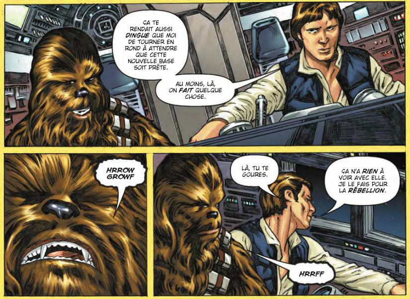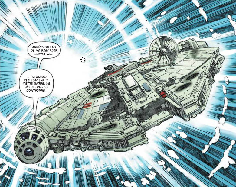 En effet, les références sont multiples pour ceux qui adorent connaître sur le bout des doigts leur encyclopédie Wookiepédia, et plus particulièrement l’univers étendu qui prend fin avec les nouveaux épisodes. Du croiseur impérial de classe Carraque à la petite mention de Mako Spince, sans oublier la belle référence au nom de la mère de Han, Jaina (également sa fille dans l’univers étendu...), beaucoup d’éléments contribuent à créer une atmosphère de nostalgie particulière à l’univers Star Wars. Le fait de rappeler des races connues, des escadrons de légende tout en ajoutant quelques nouveaux visages, est une caractéristique des romans et BD Star Wars. Ce volume icône est en fin de compte un hommage en bonne et due forme. A l’image de la petite histoire qui raccorde le monde de Han Solo... à celui d’Indiana Jones, soit deux légendes synonymes d’aventure.