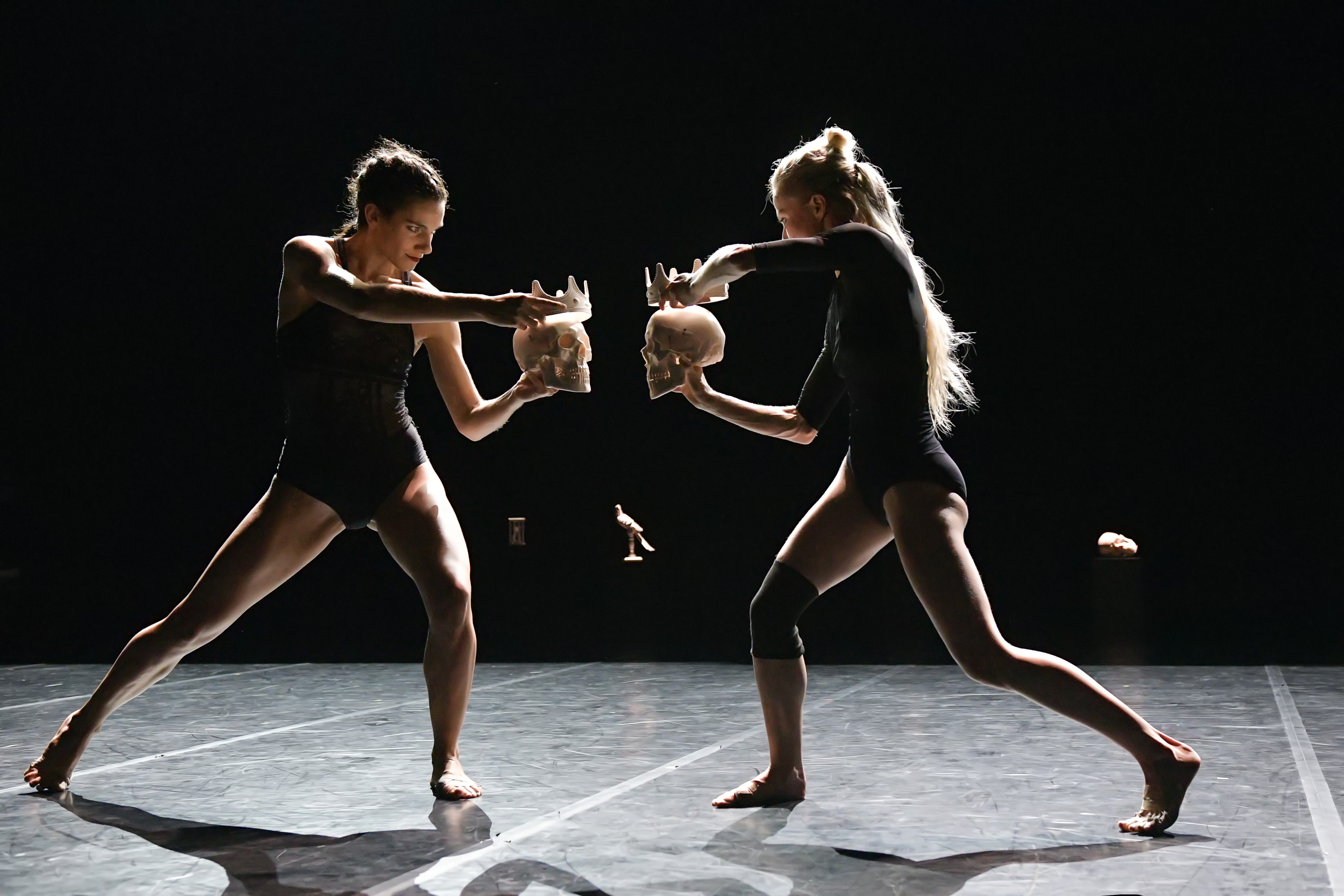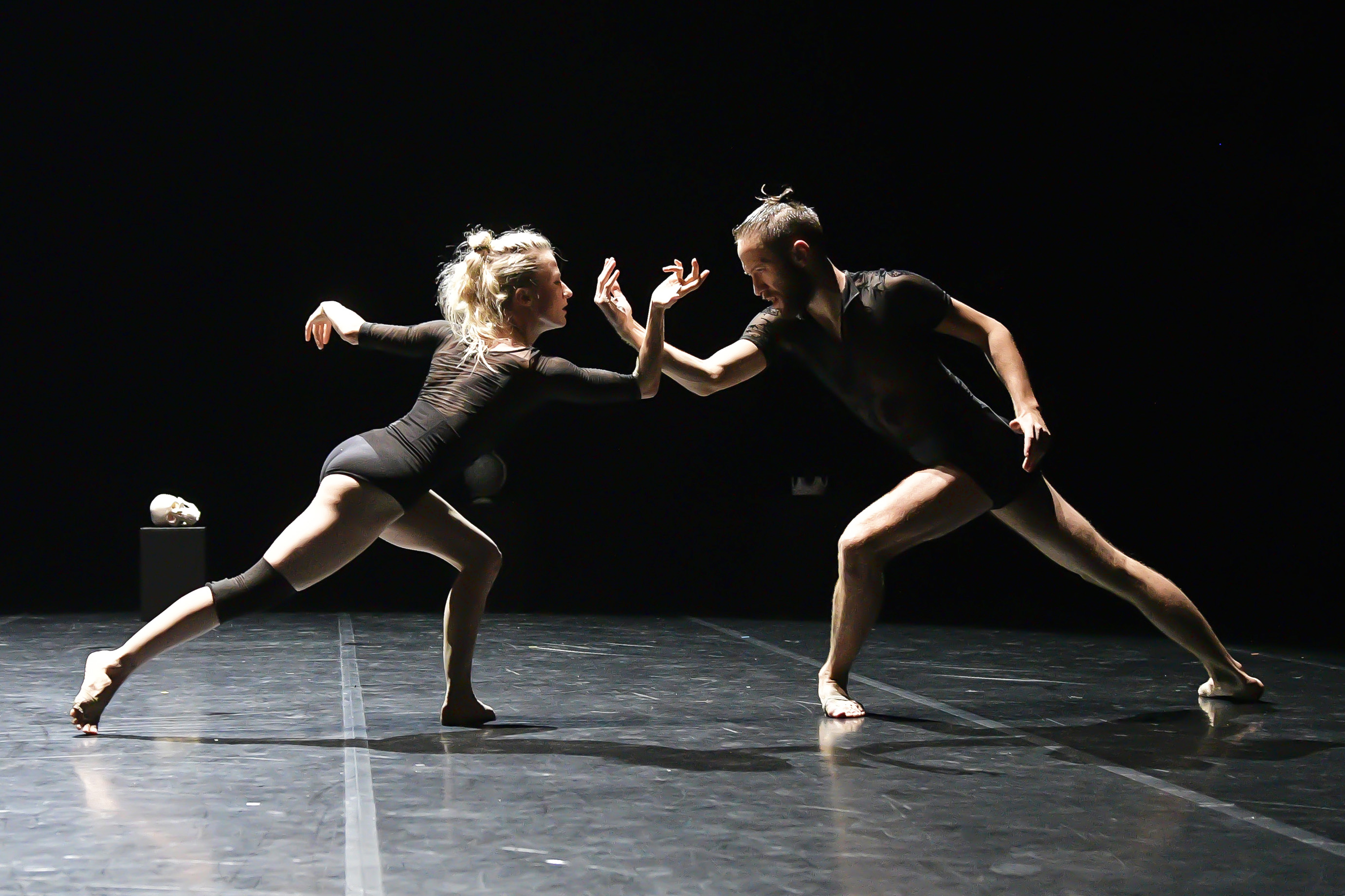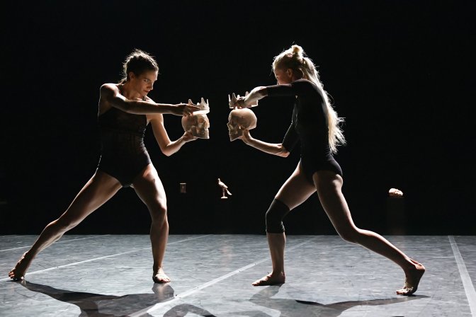 Pour Still life, le bain sonore est tiède et parfumé aux années 80, kaleidoscope acoustique façon Ircam. Noto et Sakamoto, compositeurs hors-pair par ailleurs, imitent le Velvet underground et leurs bruits de machines, avec une réserve toute nippone. Ils enchaînent subtilement les mix de cliquetis, de grincements de roues, exploration high-tech en-deça du bruitage. Ils donnent pour nom à leur œuvre le numéro 79D. 69 aurait pu encore faire rêver mais dix de plus exclut la sensualité. Avec le temps, ce qui leur était nécessaire en tant que compositeurs nous est indifférent en tant qu’auditeurs. Le risque pourtant, c’est que tous ces bruits pizzicato de machines glougloutantes ne viennent déteindre sur la chorégraphie en lui donnant une ergonomie de robotique. Heureusement, Angelin Prejlocaj présente une œuvre magnifiquement dansée comme à son habitude. Les duos en série (deux danseurs exécutant les mêmes pas) y sont parfaitement réglés, les duos (deux danseurs exécutant des pas complémentaires) sont gracieux, les corps s’emmêlent, se répondent, les gestes sont émouvants. Le meilleur moment est soutenu par des violoncelles quand un couple s’ébat dans un cône de lumière. Un oasis avant de repartir vers les borgborygmes de digestion du droïde R2-D2 de StarWars. Passons. Les danseurs sont habillés de noir, deuil oblige, puisque le spectacle mesure la brièveté de la vie et les vanités humaines. Six objets symboliques blancs de Still life qu’on retrouve dans les peintures de nature morte sont brandis en cercle par les danseurs, comme le ferait une divinité indienne, pour raconter ce qui nous agite sur cette terre. Un crâne, une couronne, un sablier,…. En signe d’aveuglement, les danseurs se cagoulent de larges boites, car celui qui ignore les vanités reste dans le noir ésotérico-mystico-philosophique. Il y a une véritable esthétique visuelle dans ce spectacle sans rapport avec la bande-son qu’on aimerait aussi riche que la danse.