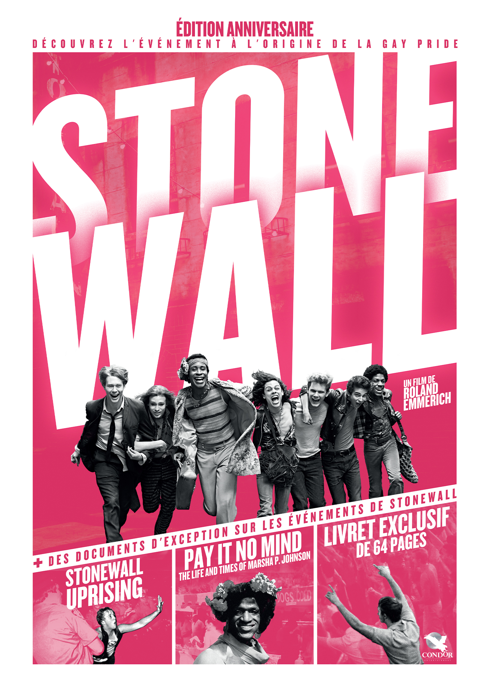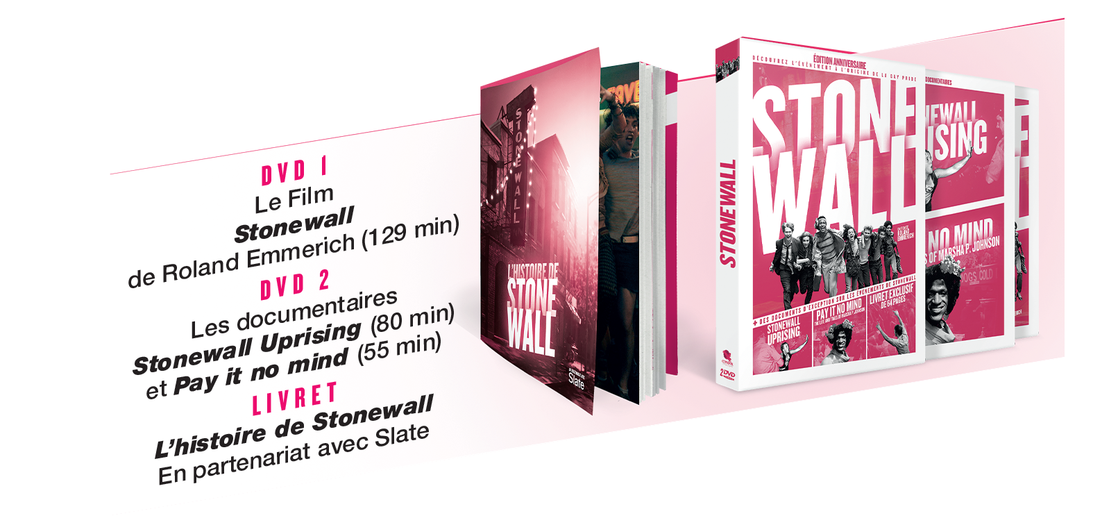 Résumé : Le 28 Juin 1969, des émeutes ont éclaté au bar Stonewall Inn à New York, un soulèvement qui changera à jamais la lutte pour les droits des homosexuels et donnera naissance par la suite à la première marche des fiertés. Cette édition anniversaire vous invite à vous plonger dans cet événement fondateur du militantisme LGBT à travers des contenus riches. En plus du film de Roland Emmerich, découvrez deux documentaires : Stonewall Uprising, une oeuvre revenant sur les émeutes de 1969, et Pay It No Mind, qui retrace la vie de Marsha P.Johnson, l’icône transgenre de cette époque. Un livret de 64 pages vient compléter ce coffret exceptionnel.
