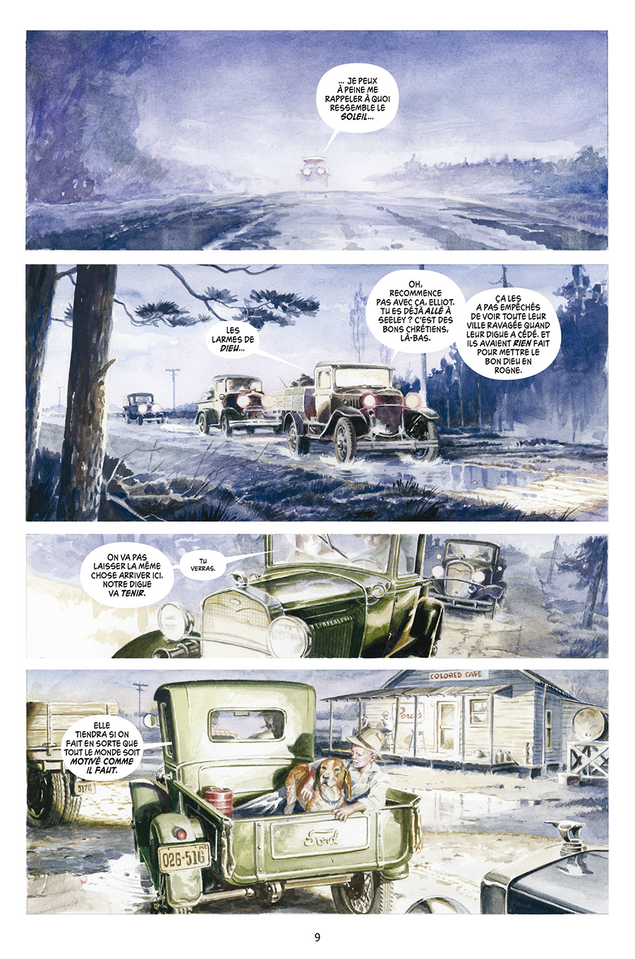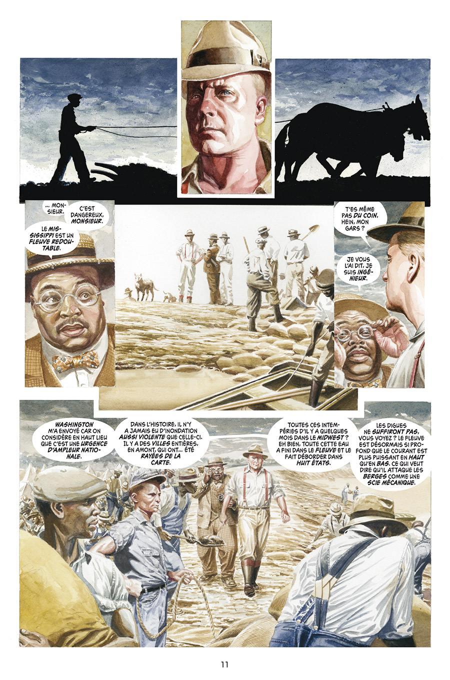 Ils ont été nombreux à chanterce vieux refrain triste, de Billie Holiday à Joe Bonamassa en passant par Nina Simone. En voyant la magnifique couverture, en se remémorant les paroles de cette ode aux Noirs des états du Sud qui étaient pendus à cause de la couleur de leur peau, on se dit que le sujet choisi par Mark Waid est sans surprise : la cause des droits civiques, l’égalité, la tolérance et le Blues. Évidemment, il y a de ça, mais ce qui aurait pu être une chronique évidente se révèle bien plus surprenante. Car Strange Fruit est finalement un mélange du Jour où la Terre s’arrêta et la légende de John Henry. Une fresque historique avec un élément anachronique, ou plutôt extraterrestre, qui casse tout, des codes de la société blanche de l’époque aux digues qui peuvent prévenir la grande inondation du Mississipi de 1927. Le choc est, il faut bien l’avouer, assez déroutant pour le lecteur, car les indices ne laissaient pas envisager un tel scénario. Le Ku Klux Klan qui veut se faire respecter en ces temps où la nature menace, une veuve qui défend bec et ongles ses métayers Blacks, un sénateur à cheval entre l’ombre et la lumière... Tout semblait normal, sans aller vers Autant en emporte le vent, mais typique, presque familier et rassurant. Jusqu’à l’arrivée d’un colosse nu et invincible, venu de loin mais familier à la violence. Son histoire sera courte, parfaitement mise en tension par la menace des inondations qui restent en arrière plan jusqu’au dénouement final.