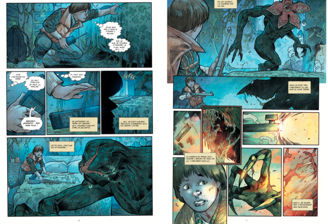 En ce qui concerne l’aspect graphique, ce comic-book est une belle réussite. Les illustrations de Stefano Martino sont plutôt belles. Il est a noté le travail sur la couleur qui est absolument remarquable avec un jeu entre couleurs froides et couleurs chaudes pour distinguer les univers. L’ambiance de l’ Upside Down réside donc beaucoup dans les teintes utilisées qui subliment les planches notamment en ce qui concerne les décors.