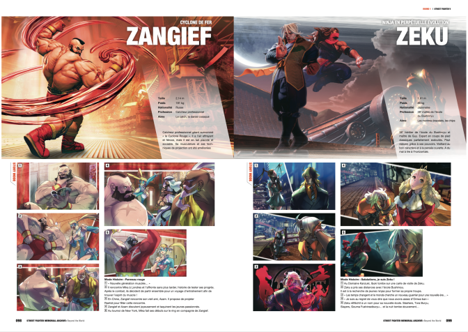Enfin, pour les fans du cinquième volet de la licence, beaucoup de contenu bonus a été ajouté à l’ouvrage. On peut ainsi retrouver des fiches personnages de tous ceux jouables, un organigramme très complet des relations qu’ils entretiennent, ainsi que le détail des tenues spéciales de Chun-Li, crées par Akiman lui-même. Quelque trente pages sont dédiées au guide des personnages de l’Institut de recherche sur le combat de Shadaloo, listant l’intégralité des combattant apparus dans l’ensemble des jeux.