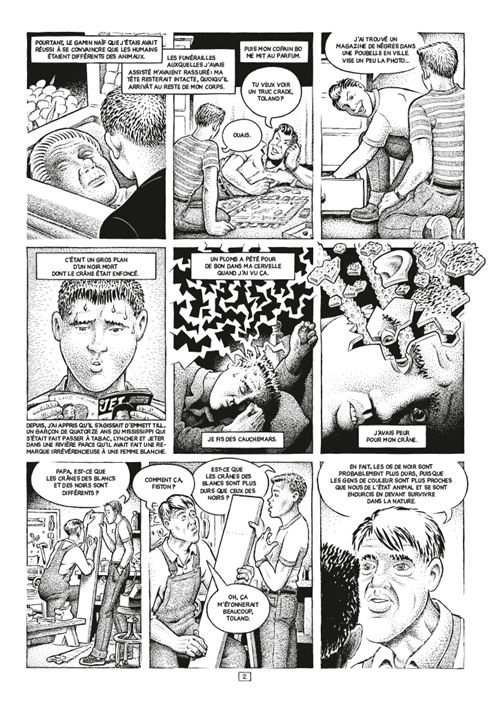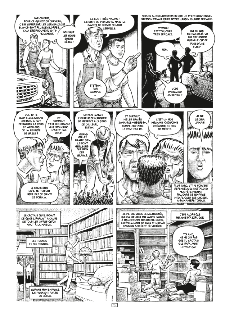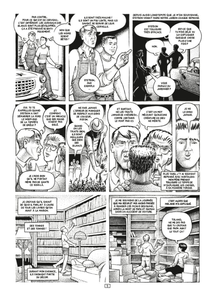 Ce livre est gigantesque par son courage, son sujet et son dessin. Avec ses personnages aux traits arrondis, aux corps engoncés comme s’ils étaient tous trop larges pour leurs âmes, on sent que l’auteur a voulu à la fois incarner la maladresse et la balourdise, et étrangement les personnages les mieux dans leur peau n’ont pas cette forme, mais plutôt des mentons carrés et des nez aquilins. Le noir et blanc est ici sublimé, parcouru d’une multitude de tâches, qui s’agglutinent et s’agrègent petit à petit pour former des reliefs, des teintes, des motifs. La tâche n’est par ratage, elle est élevée au rang d’art.