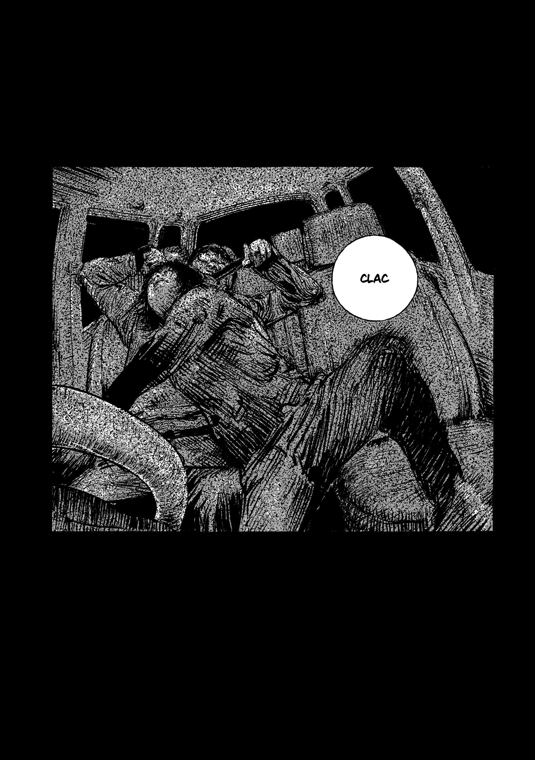 En effet, Taro Kanafuro opte pour un style particulier. Il dessine de manière très réaliste, en accentuant les gros plans et les perspectives exagérées, des personnages qui pourraient être nos voisins, voire nos conjoints. Pour aggraver le trouble, il impose un noir dense, omniprésent, que ce soit dans de larges aplats créant des masses impénétrables et oppressantes, mais aussi dans ces points noirs qu’il distille tout au long des cases et qui obscurcissent encore plus notre vision. Que voyons-nous dans la case ? On se rapproche un peu et soudain, on n’est plus très sûr d’avoir envie de savoir et pourtant, on se rapproche encore un peu jusqu’à comprendre... et regretter de s’être penché si près. L’horreur est parfois montrée, parfois floutée, quand elle devient trop gore ou trop sexuelle, et parfois laissée à l’imagination du lecteur, ce qui n’est pas forcément plus rassurant. Les planches composées de petites cases nous enferment dans cette narration, et les alternances entre les pages à fond blanc et celles à fond noir accentuent notre immersion dans une obscurité peu accueillante.