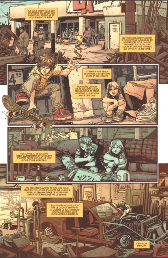 Tout comme dans le premier opus, Bermejo - cette fois-ci uniquement au scénario - conduit à nouveau son histoire à travers plusieurs points de vue qui se croisent et s’emmêlent au fur et à mesure du script. Le nœud principal est celui de Trix et son frère, incarnations de ce qu’a pu engendrer le séisme, purs produits de la sauvagerie, nés dans la violence et ne survivant que grâce à elle. Ils représentent une nouvelle catégorie de personnages dans l’univers de Bermejo mais leur rencontre avec l’ancien Suicider, héros du tome 1 désormais retraité, est hélas trop artificiel. Repartir à zéro dès le tome 2 donne cette sensation étrange de n’avoir pas assez connu et de ne pas avoir éprouvé assez d’empathie pour les anciens personnages auxquels ils sont confrontés. De nouvelles têtes et de nouvelles problématiques s’invitent donc dans cet univers étendu mais n’arrivent pas réellement à se justifier pleinement dans l’histoire, autrement que pour illustrer un nouveau discours. Les coutures du scénario sont alors trop visibles : lorsqu’on arrive à voir l’auteur derrière les lignes, c’est qu’il est souvent trop tard.