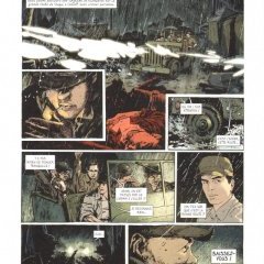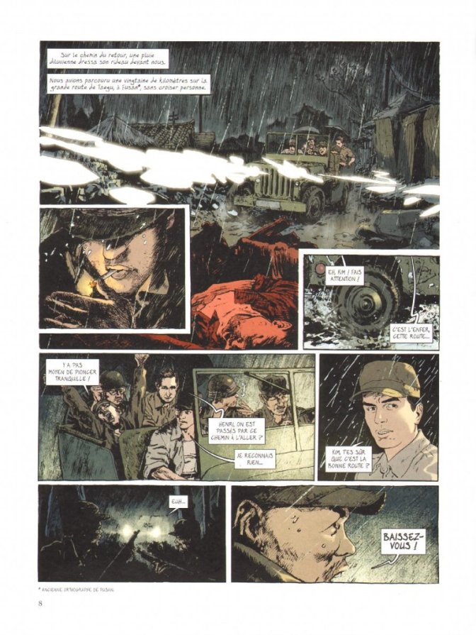 L’ensemble est graphiquement très homogène, avec une Corée loin des clichés contemporains, mais avec des champs ravagés, des routes entaillés, des villages éventrés, le tout baignant dans une boue brune qui enveloppe tous les lieux et les personnages, tant et si bien que les uniformes ne se distinguent plus vraiment au bout de quelques semaines. Fait qui n’est pas anodin, aucune planche ne se retrouve tâché de sang ou de moments insoutenables. La violence et la barbarie, inhérentes à toute guerre, ont leur place, mais aucune case ne viendra perturber le sommeil du lecteur, car si une attaque de voiture ou le spectacle d’un village rasé viennent évidemment se placer comme des moments phares, ils n’ont pas de portée horrible ou de détails macabres. Grâce aux écrits de Turenne, quelques moments de joie, comme un verre brandi au milieu d’un bar, ou de deuil, comme la perte d’un collègue et ami au cœur du conflit, le dessin fait prendre vie à ce récit/reportage clef.