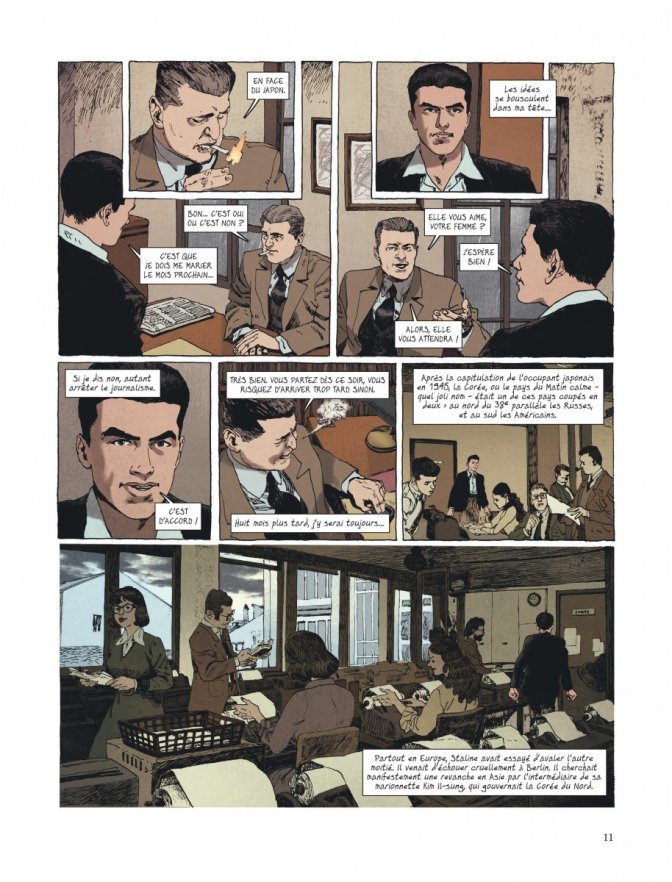Critique : Écrire pour informer, décrire pour expliquer, et maintenant dessiner pour continuer ce travail : c’est autour de cette tâche que se construit l’ambition du journalisme. Cette collection adapte en roman graphique les lauréats du prix Albert Londres, ces reportages d’exception, aussi bien dans le style littéraire que dans les évènements et dans les thématiques. Avec Sur le front de Corée, dont le titre explicite nous ramène près de soixante-quinze ans en arrière, dans un pays depuis fracturé qui, il faut le rappeler, semblait le théâtre idéal pour lancer une Troisième Guerre mondiale. Stéphane Marchetti s’est donc attaché à reprendre le texte original de Henri de Turenne, grand reporter qui a du ajourner de plusieurs mois son voyage de noces. Les phrases sont choisies et viennent se greffer à cette actualité brûlante, et l’on a ici un quotidien presque habituel pour les phases d’une guerre vue par ceux qui la transcrivent : l’attente, beaucoup, et les manques qui s’imposent, comme la nourriture ou un endroit ou dormir, et les moments de panique et d’adrénaline, rares mais intenses, lorsqu’une percée se rapproche, ou qu’une ville est prise. La guerre et ses aléas y sont donc parfaitement placées, comme un miroir de ce qui se déroulera encore et encore, jusqu’en Ukraine ou au Liban de nos jours.