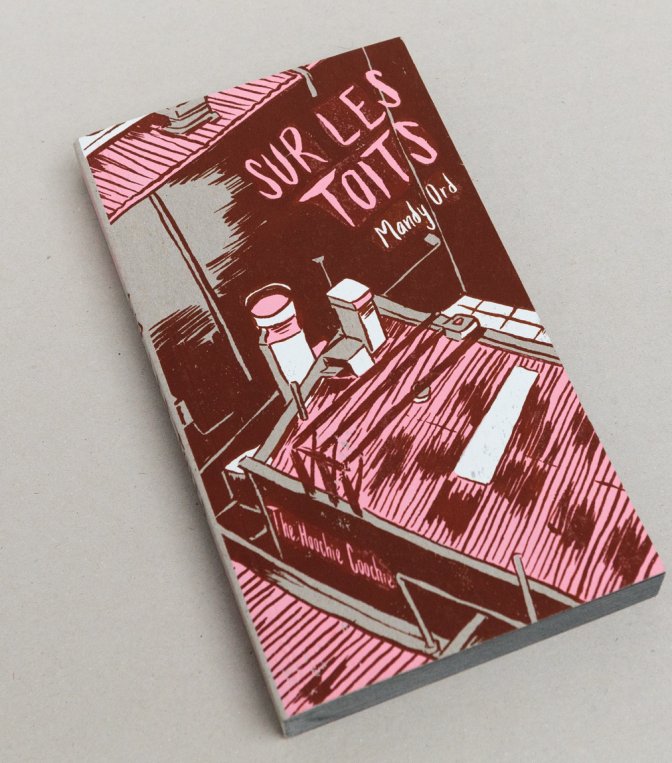 Publié en 2007 en Australie, Sur les toits est le premier ouvrage publié en France de Mandy Ord – et le premier ouvrage de l’autrice qui en a publié d’autres depuis –, une dessinatrice jusqu’ici totalement inconnue dans l’espace francophone. Ce récit autobiographique raconte une soirée de l’autrice-personnage qui tourne autour d’une virée au cinéma sur un toit de Melbourne. Détail étonnant, Mandy Ord se représente toujours de profil et borgne – ce que l’autrice n’est pas –, à l’inverse de tous les autres personnages. Le récit n’offre aucune piste d’explication sur ce point.