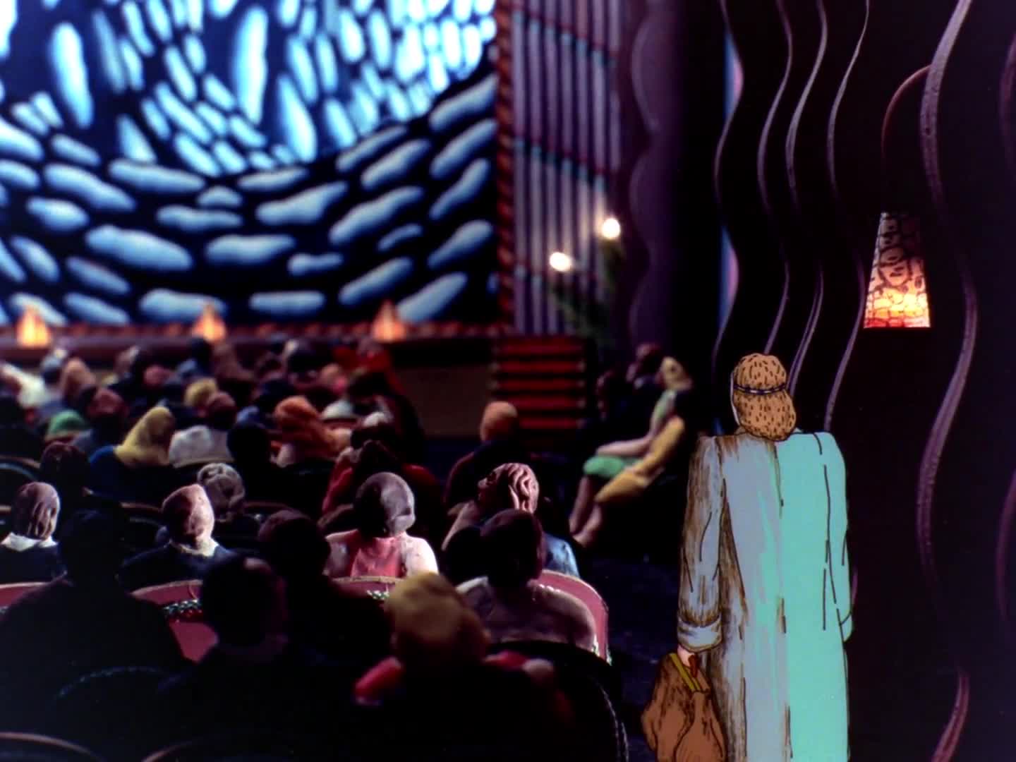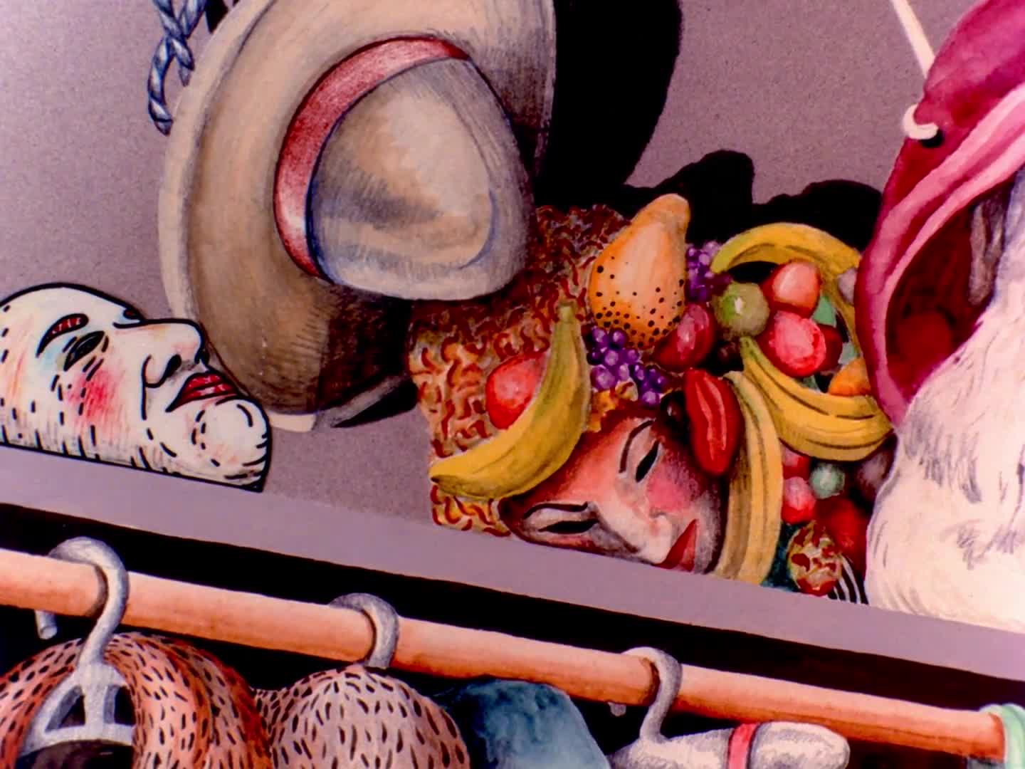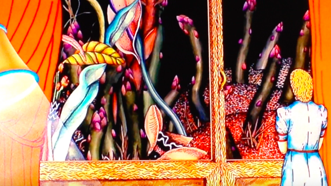 Tout comme Lynch, Pitt avait, cela dit, tourné une bonne poignée de courts métrages avant Asparagus. Son background est celui d’une peintre et c’est au début des années 1970 qu’elle découvre l’univers de l’animation. Comme elle l’explique dans le documentaire Persistence of Vision (2006), c’était comme si ses peintures avaient un passé et un avenir et elle a souhaité à un moment exprimer ce passage du temps à travers les images animées. Asparagus est, en ce sens, un très bon exemple de son travail. Mêlant décors d’appartement, urbains et visions fantasmatiques où le monde naturel se déploie en couleurs vives, le film développe une fluidité où chaque image donne naissance à la suivante. Des fenêtres s’ouvrent sur des mondes imaginaires et la narrativité est mise de côté pour se plier à la logique du rêve. De loin, son film le plus délibérément jungien et sexuel, Aspargus multiplie les références érotiques : une héroïne limitée à une bouche et un anus, fellation et masturbation d’asperges, serpent phallique qui se resserre autour d’une jambe féminine, etc. Les formes changent en permanence, les proportions sont chamboulées et les visuels se font de plus en plus hallucinés. Autres éléments caractéristiques du travail de Suzan Pitt : l’importance apportée à la musique - ici un mélange de compositions cosmiques de Richard Teitelbaum mêlées au free jazz de Steve Lacy -, le goût pour des scènes absurdes et étranges et aussi le désir d’expérimenter différentes techniques d’animation au sein du même métrage - dans la scène de théâtre par exemple où l’héroïne dessinée se mêle à des personnages en pâte à modeler. On sent tout au long de ce poème visuel un discours sur le théâtre, la fantaisie et l’acte créatif, notamment de par le fait que la protagoniste porte un masque dès qu’elle sort de chez elle ou de par le motif du miroir ou de la vitre. Chacun peut se créer son interprétation et c’est ce qui en fait une œuvre indéniablement puissante.