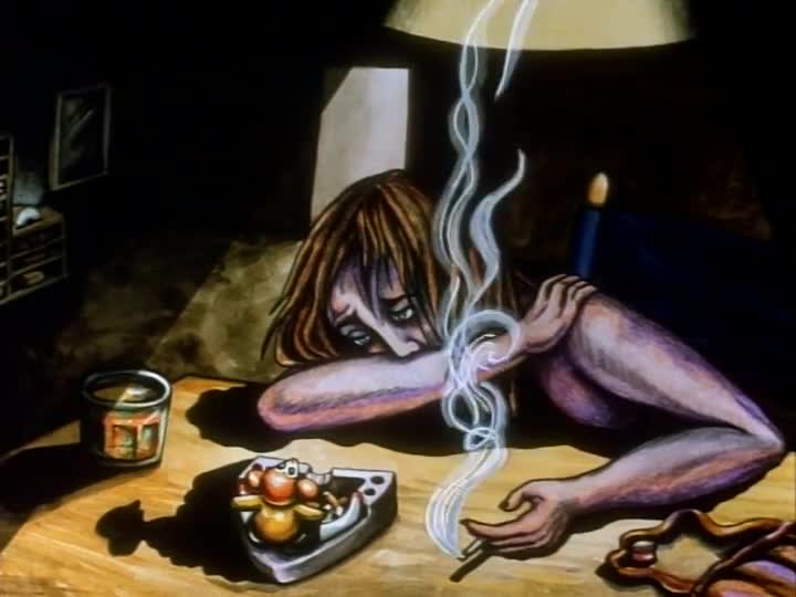 Si les détails sont déjà très denses dans Asparagus, que dire du film suivant, Joy Street (1995) qui prendra plusieurs années avant d’être finalisé. L’ambiance y est aussi hypnotique, mais plus mélancolique, traitant ouvertement de la dépression et du suicide. Toujours au son d’une bande originale mêlant sonorités jazz et musique ambient/drone, nous sommes les témoins d’une femme seule, triste, au bout du rouleau. Elle essaie d’appeler des gens au téléphone mais personne ne lui répond. Elle boit, elle fume, mais rien ne lui redonne la joie de vivre. Pourtant, une souris imbriquée dans un cendrier va s’animer et tout va alors devenir délirant. Objets, plantes, animaux se fondent pour créer de nouvelles formes. La chanson "What a Wonderful World" est diffusée sur les ondes. Et afin de ranimer le cadavre de la jeune femme, la souris - à présent devenue géante - va convier dans cet environnement urbain tout un imaginaire sauvage lié aux forêts tropicales. Sauterelles, serpents, singes, grenouilles, moustiques, lianes et nénuphars exercent alors leur chorégraphie de retour à la vie, et le personnage va renaître pour connaître la rédemption et un bonheur de vivre qui avait disparu. Là encore, Pitt fait preuve de beaucoup d’imagination. Elle utilise des vraies photographies pour dépeindre la ville et elle est partie vivre dans les jungles du Guatemala et du Mexique afin de rendre ses peintures les plus vivantes possibles. Le résultat est fascinant, riche et encore une fois l’artiste nous offre une belle ode à la vie.