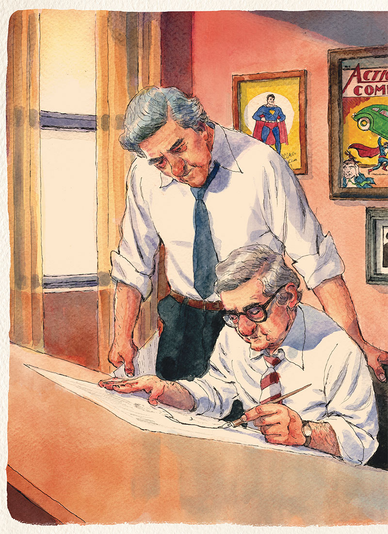 Pendant les recherches préparatoires de Julian Voloj, son agent a rencontré le dessinateur Thomas Campi. Ce dernier a réalisé un travail parfait sur l’album. Entre impressionnisme et pop’art, Campi joue avec le réalisme et l’onirique dans ce travail de mémoire. La suppression de la ligne claire à chaque fois que l’album relate le passé de Joe Shuster a un côté symbolique intéressant puisqu’il revient sur un style très représentatif de la classe moyenne de l’époque tout en accentuant l’idée qu’avant Shuster et Siegel, la ligne claire n’existait pas et donc par extension, la bande dessinée. Ce faisant, les créateurs de Superman sont remis au centre de toute l’industrie du comics qu’ils ont créé.