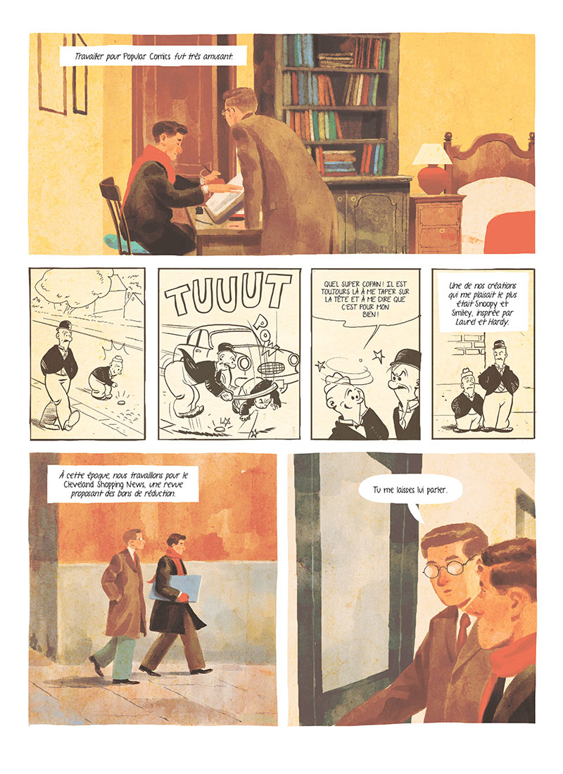 Cet album est un condensé d’émotions car il est si bien écrit que l’on pourrait penser lire une autobiographie. C’est à travers les yeux de Joe Shuster que l’on découvre son monde de la bande dessinée, son bonheur d’avoir découvert sa vocation, ses efforts, ses succès et sa lente descente aux enfers. Plus encore, on s’identifie à Joe Shuster car il est dépeint comme une personne qui a subit tout au long de sa carrière. Il n’a jamais négocié, il n’a jamais vraiment protesté, et cela créé un sentiment d’impuissance de notre part qui permet de s’identifier à lui.