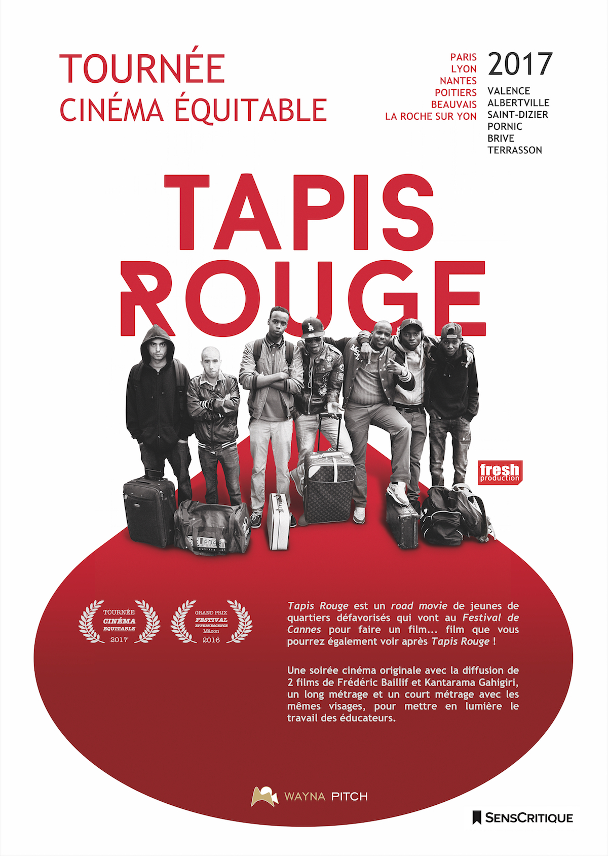 Résumé : Tapis Rouge est un road movie de jeunes de quartiers défavorisés qui vont au Festival de Cannes pour faire un film... film que les spectateurs pourront également voir après Tapis Rouge ! La promesse d’une soirée cinéma originale avec la diffusion de 2 films, un long métrage et un court métrage avec les mêmes visages, pour mettre en lumière le travail des éducateurs.