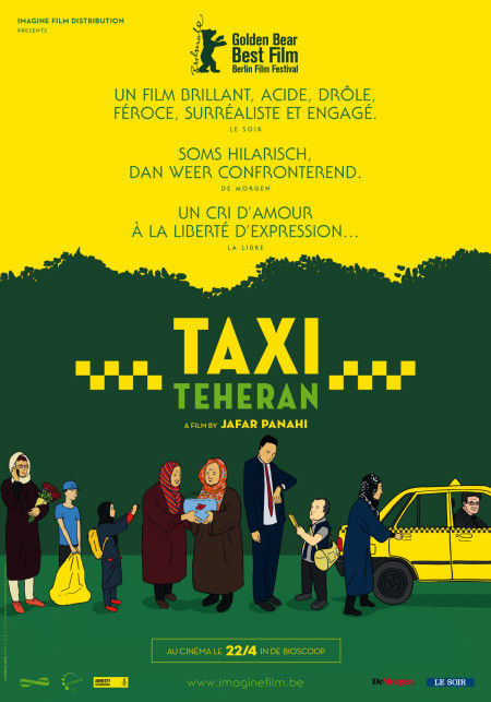 Taxi Téhéran, c’est d’abord un vieux véhicule jaune qui déambule dès les premières heures du jour dans un Téhéran grouillant de vie. Premier arrêt : un homme monte près du chauffeur, qui reste hors champ, puis une femme s’installe à l’arrière. L’homme raconte au chauffeur – toujours invisible – une anecdote évoquant un vol de roues de voiture et appelant à en pendre les auteurs. La femme intervient pour manifester son désaccord avec cette opinion. L’homme loue alors les lois de la charia, la femme lui rétorque que la seule conséquence de son application est de placer l’Iran au second rang (après la Chine) des pays où il y a le plus de condamnations à mort. L’homme, exaspéré par les « idées modernes » de cette femme enseignante, sort du taxi… Autre portrait, et tout différent, que celui de cette autre femme éplorée, qui accompagne un mari blessé dans un accident de la route et qui saigne sur ses genoux. Elle semble en fait davantage préoccupée par l’existence d’un éventuel testament de son mari que par l’état de santé de celui-ci… Puis on découvre que le chauffeur de taxi n’est autre que Jafar Panahi, affublé d’une casquette, qui garde un grand calme dans ces premières situations plutôt violentes. Le cinéaste est ensuite vite reconnu par un jeune dealer de DVD piratés, qui voudrait bien l’associer (avec son taxi) à la promotion de son petit commerce.