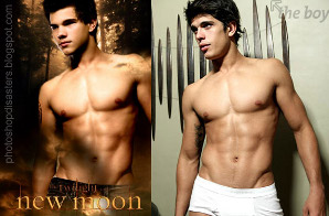 Ceux qui ont vu le film Twilight 2 ont compris que Taylor Lautner n’en avait vraiment pas besoin, mais pourtant les rois du marketing d’Hollywood auraient exigé que le comédien soit retouché sur l’affiche du dernier opus de la saga Twilight ! Ses abdos et son torse de rêve auraient été empruntés à un top modèle. Dans le monde impitoyable de la retouche photo, qui vaut au tout Hollywood corps de rêve et dents blanches, même la jeunesse immaculée subit les exigences d’une société obsédée par la perfection. L’affaire amusante crée un buzz énooorrmmme sur la toile depuis que l’excellent site Photoshop Disaster (un must à visiter !) a révélé la supercherie le 25 février dernier !
