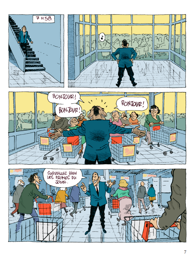 Tête de gondole allie la chronique familiale à la critique sociale pour un jeu de massacre à la mécanique bien huilée, efficace et drôle. L’histoire est habilement construite et avance sans temps mort, les dialogues sont aiguisés et le dessin de Nicoby, enlevé, va à l’essentiel ou, au contraire, s’attache à des détails qui établissent une atmosphère, posent un personnage…