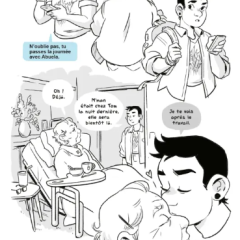 Pour le dessin, l’évolution est encore plus nette : de par le choix du noir et blanc, à de rares occasions agrémenté d’un peu d’écarlate sanguinolent ou d’un orange sablonneux, l’autrice a voulu basculer dans une ambiance proche du polar plutôt que de la romance ado. De fait, une enquête se tisse pour le lecteur, pour connaître les affaires sombres qui ont émaillé le passé des deux personnages de la couverture de l’album. Ces protagonistes, aux visages toujours rondelets, aux yeux tristes et aux épais sourcils, sont eux bien dans le style habituel, mais dans leurs écarts, dans leurs attitudes, là aussi on dénote quelque chose de plus tendu, de moins heureux, comme si l’espoir avait disparu, avant de renaître, un peu, dans le final.