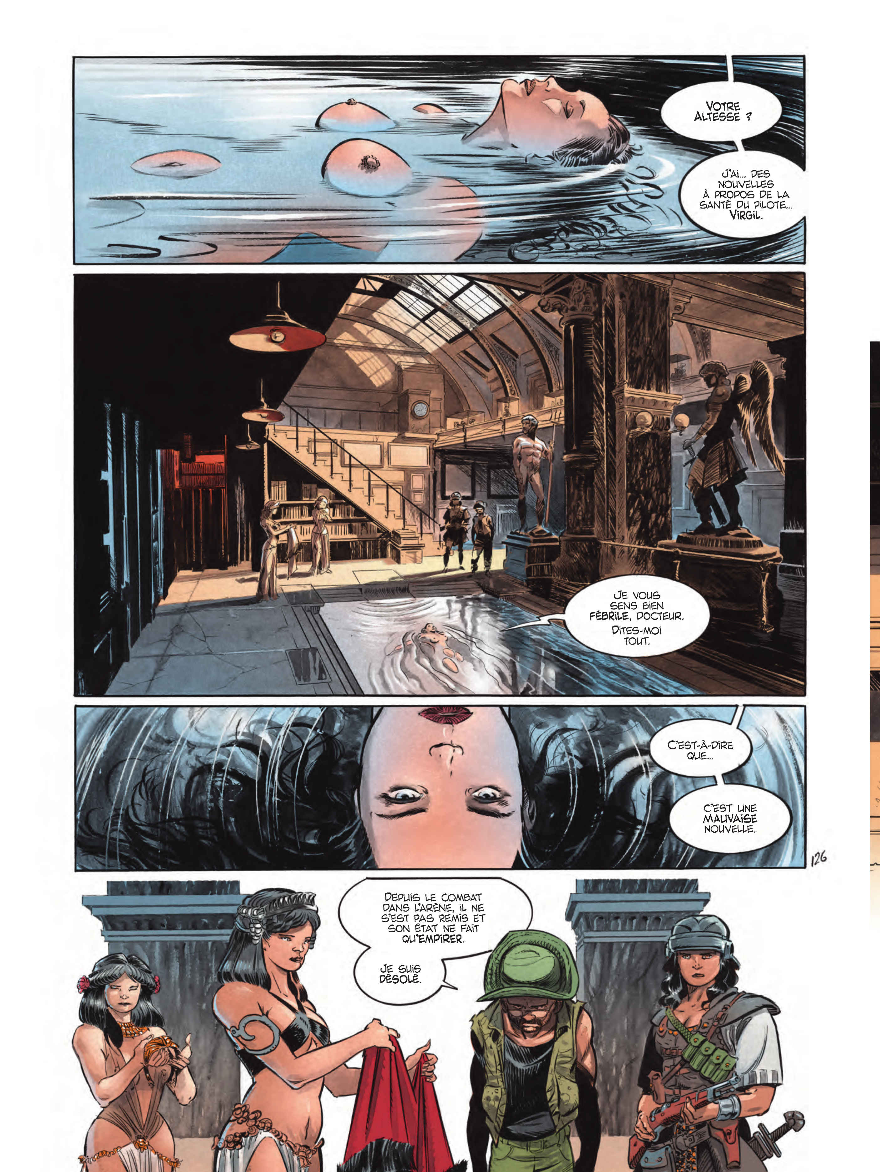 Eric Hérenguel conclut cette épopée rappelant les serials des années cinquante avec ce troisième tome. Toujours au scénario et au dessin, l’auteur nous livre une fin en apothéose où tout part en vrille (comme si c’était encore possible). Mais la fin ouvre néanmoins la porte à un nouveau cycle.