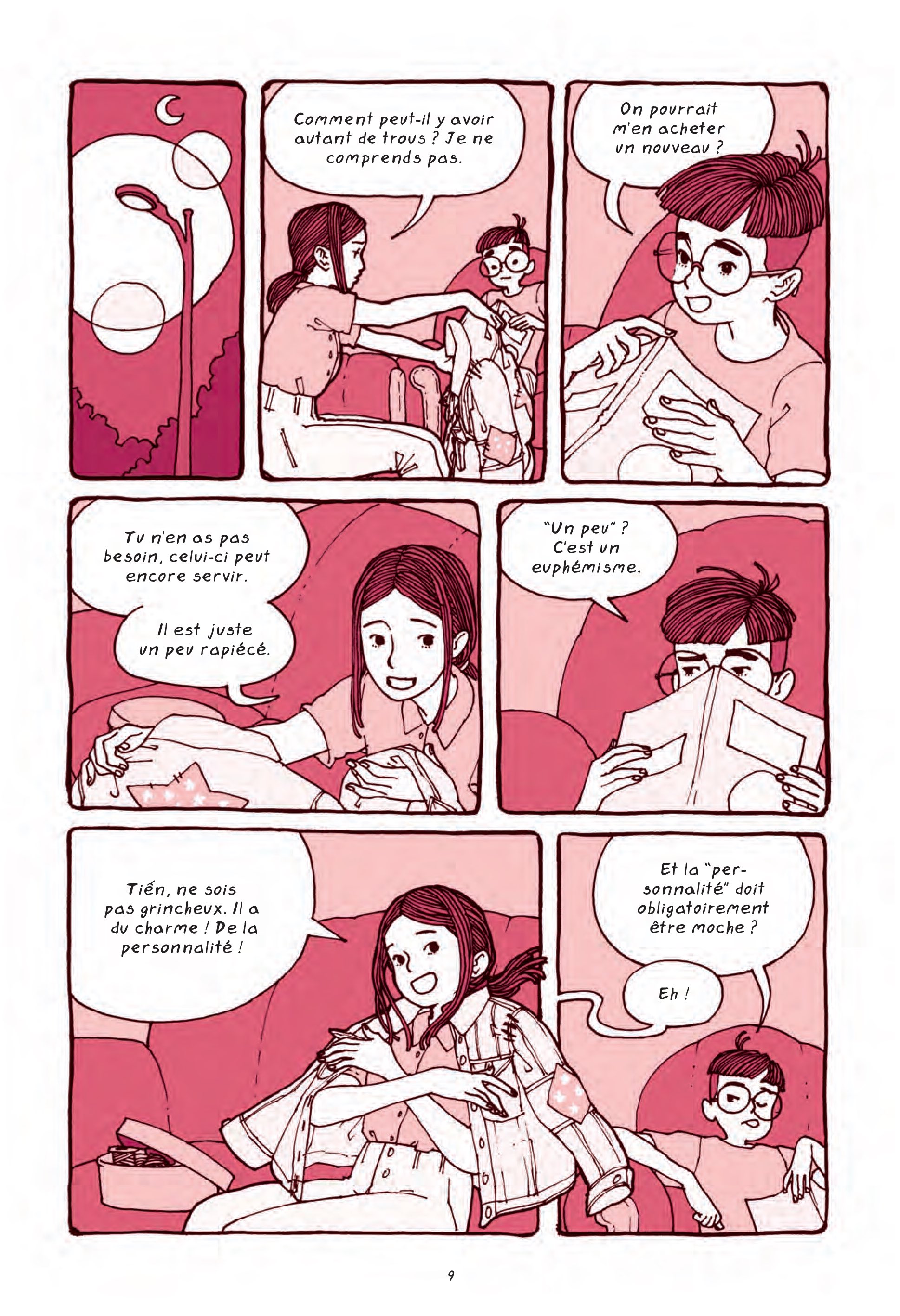 Le graphisme repose sur un dessin au trait assez fin et des aplats de couleurs, avec des décors qui sont mobilisés dans la mesure où ils servent la narration. L’artiste sait varier son découpage pour dynamiser la lecture : les parties dédiées aux contes s’écartent fréquemment du gaufrier pour donner davantage de place à l’imaginaire. Sur les choix de représentation, le dessinateur affirme dans la postface avoir « considéré que chaque personnage avait un vocabulaire visuel différent, influencé par ses expériences personnelles » et donc que « la façon dont chaque personnage envisage l’histoire qu’il raconte est basée sur les choses qu’il aurait pu voir et connaître ». Le conte Tâm Cam correspond ainsi à l’imaginaire d’Hièn et de sa tante qui lui a raconté l’histoire, à savoir le Vietnam des années 1950 marqué par le style colonial français. Loin d’être anodine, cette attention pour la contextualisation graphique des contes sert le propos de l’auteur, qui démontre que ces récits imaginaires sont toujours situés quelque part et font régulièrement l’objet de réinterprétations. Le lecteur découvrira ainsi avec curiosité – et une certaine dose d’effroi – la chute de la version vietnamienne de Cendrillon.