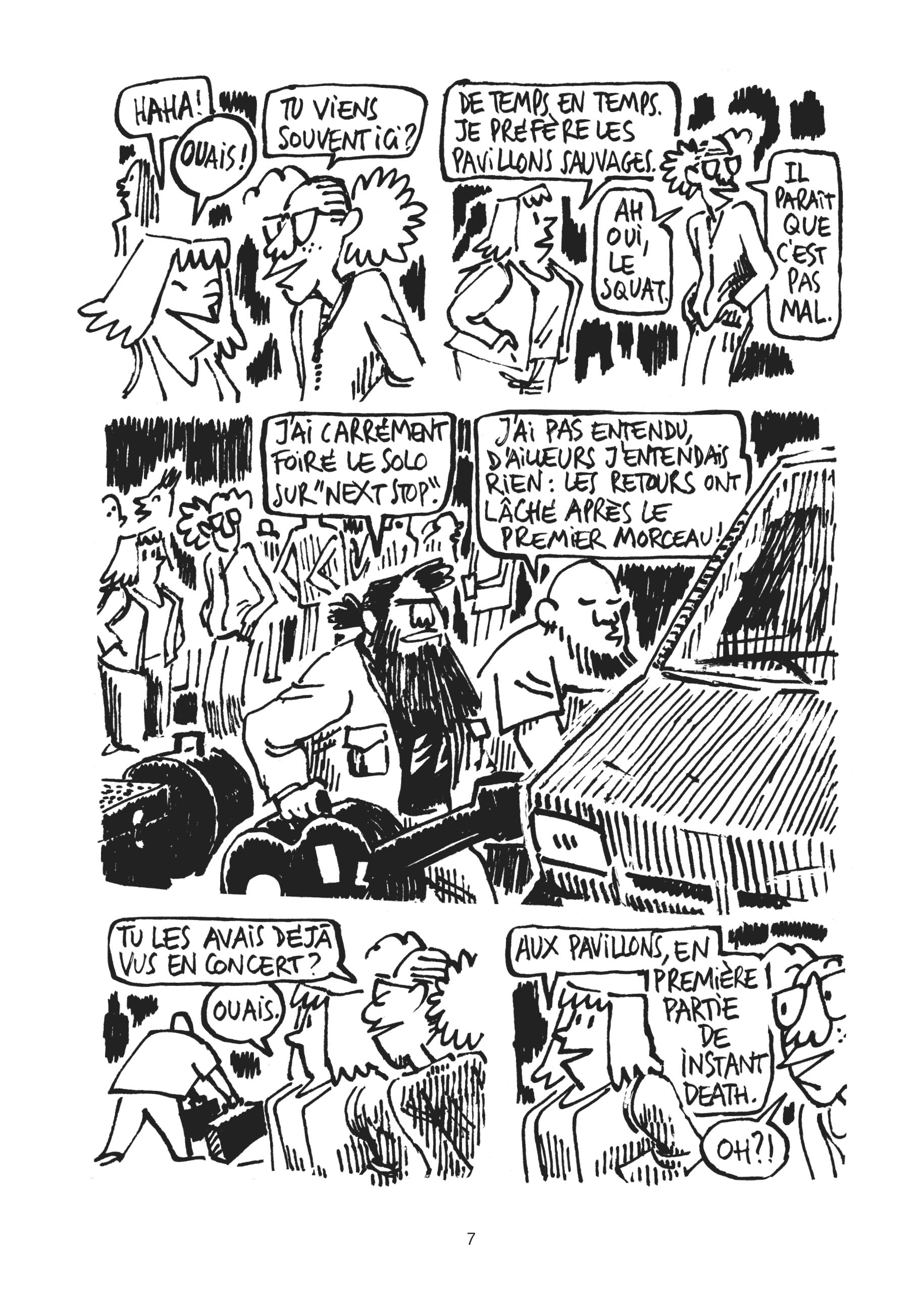 Lui-même membre de plusieurs groupes de musique parallèlement à son activité de dessinateur, Daniel Selig représente les petites joies et les galères de ce groupe sur lequel il pose un regard bienveillant mais sans candeur excessive : c’est ainsi qu’il raconte les tensions entre Philippe et Oriane lorsque le premier semble vouloir prendre trop de lumière en tant que chanteur, ou les désaccords artistiques entre les membres du groupe. Les personnages sont bien campés – avec une mention spéciale pour Oriane, bassiste, compositrice et vendeuse ambulante dans des costumes ridicules pour arrondir ses fins de mois... –, les dialogues sont savoureux et les situations sentent bien le vécu. On sourit lorsque le groupe « star » Instant Death récupère l’ensemble du cachet sous le prétexte fallacieux de frais d’essence ou lorsque Philippe, gêné, reçoit les autres membres chez ses parents un peu envahissants… L’album rappelle aussi de façon subtile le sexisme du monde de la musique lors de quelques situations bien senties (« Bah alors, les Mops font porter leur matos par leurs copines ? » lance un producteur à Oriane qui apporte le matériel dans un studio).
