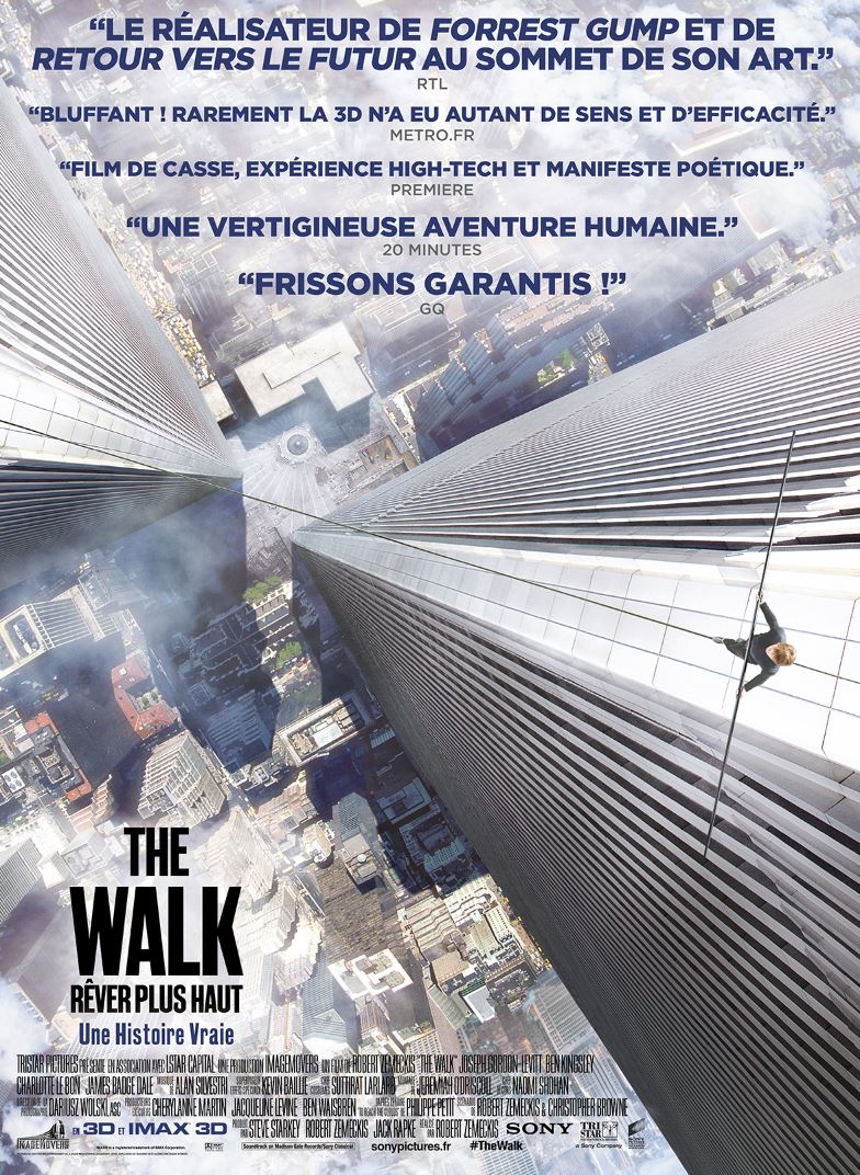 The Walk est finalement un film politique, militant avec ses armes pour plus de douceur. Les tours du World Trade Center, objets du délit, nous renvoient bien évidemment notre époque au visage, elles qui n’existent plus. C’est aussi ce que raconte The Walk : une époque où l’insouciance était permise, une époque révolue, perdue à jamais avec la chute des deux tours. Arrive alors le climax, la grande traversée, sans filet, le vide au-dessous des pieds. Le cinéma de Robert Zemeckis prend alors toute son ampleur et son lyrisme, l’artisan de cinéma devient maestro. La caméra vole, tourne, plonge, la tension est à son maximum, durant la sidérante scène de 15 mn. Et nous, pauvres spectateurs, d’attendre la fin pour reprendre notre souffle. Jamais de mémoire de cinéphile le vertige n’avait été aussi bien rendu à l’écran. Jamais la 3D n’avait eu autant de sens. Au final, The Walk dit beaucoup de choses, à des kilomètres du blockbuster d’aujourd’hui et des attentes du public. Et justement, avec une innocence touchante, il semble vouloir rappeler au monde entier à quoi servent les films : à garder espoir, tout simplement.