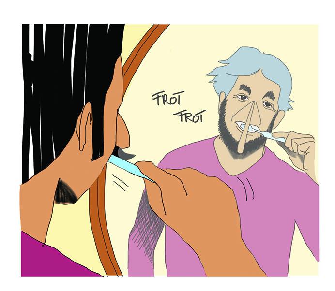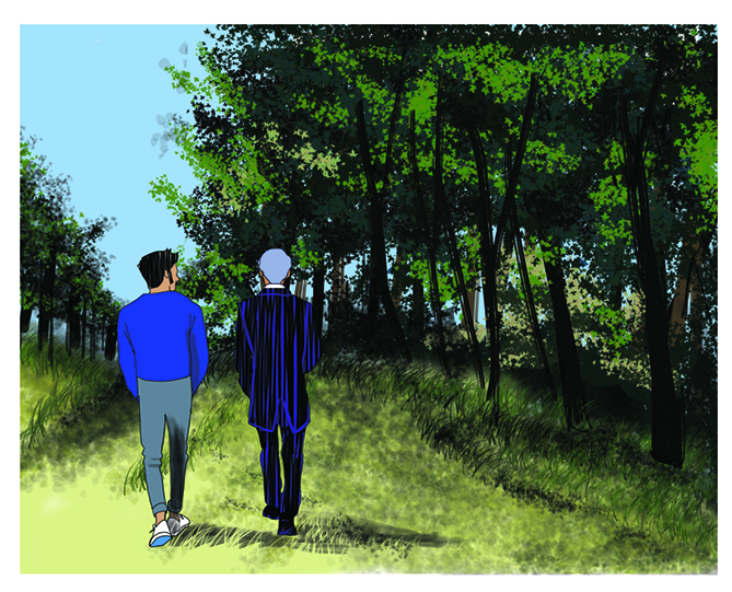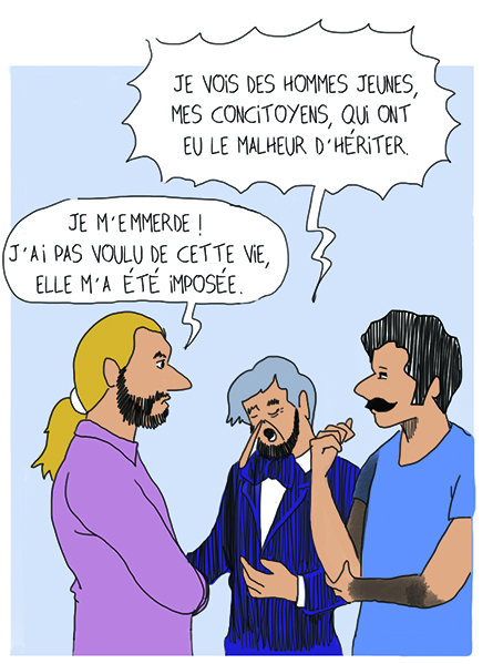 Cédric, à droite, voit surgir dans son imagination Henry David Thoreau, au centre. Le format de la bulle désigne une citation extraite de l’œuvre du père de la désobéissance civile.