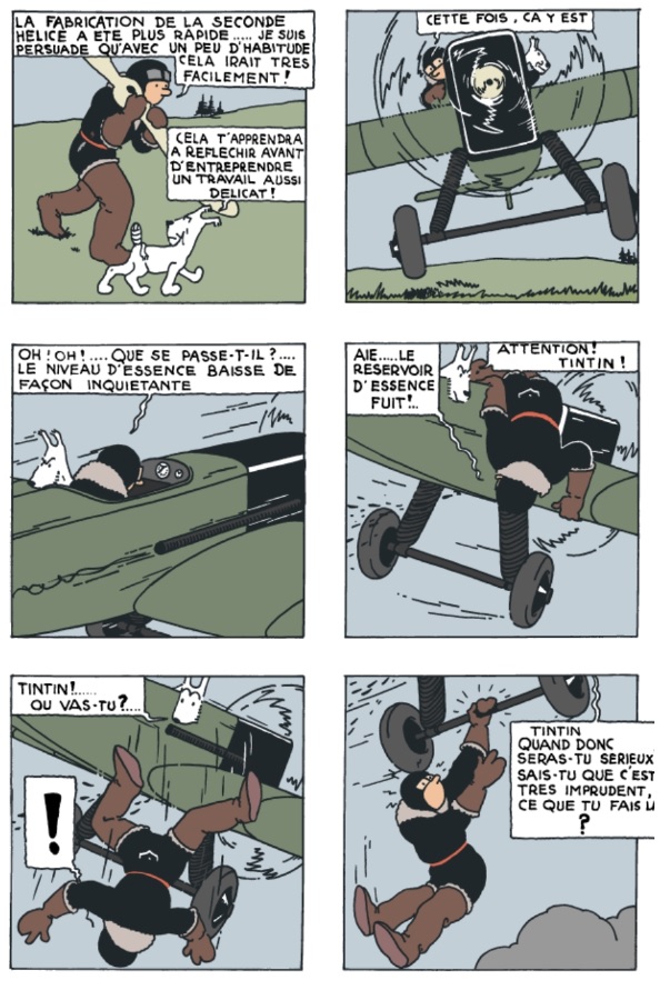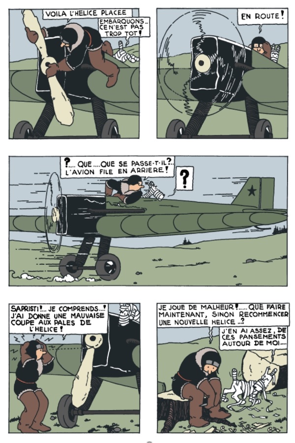 Le trait est hésitant, souvent maladroit, Hergé lui même parlera d’un péché de jeunesse mais il faut quand même l’avouer, il y a dans ce premier album la dynamique narrative, des personnages qui resteront comme Tintin et Milou et un univers de découverte du monde qui sera le socle de la série.