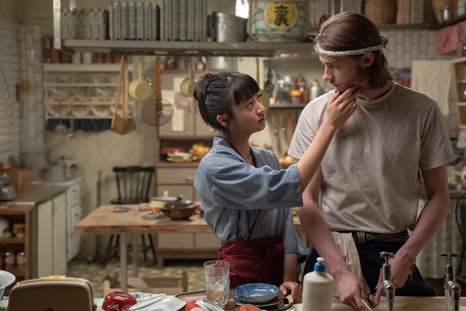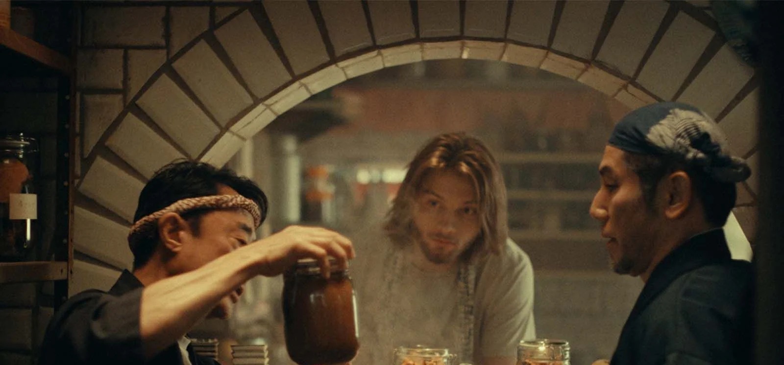 L’étalonnage imprime sur l’écran deux contrastes temporels. D’un côté, il y a le présent de Kristofer qui part à la recherche d’un passé amoureux. Il retrouve le restaurant où il a appris le métier de cuisinier asiatique, puis, pressé par le risque viral, s’empresse de rejoindre le Japon. De l’autre côté, il y a le passé qui se réécrit dans une image plus jaune, plus lumineuse. On se croirait presque attablé au restaurant, emporté par les odeurs, tant les mets qui défilent devant l’écran sont alléchants. En même temps que le jeune homme appréhende la complexité de la langue japonaise à travers sa nourriture et les haïku, il tombe amoureux de la fille du patron. Tous les deux tissent alors une relation très douce, avec en arrière-fond, le bruit des bombes qui ont détruit Hiroshima.
