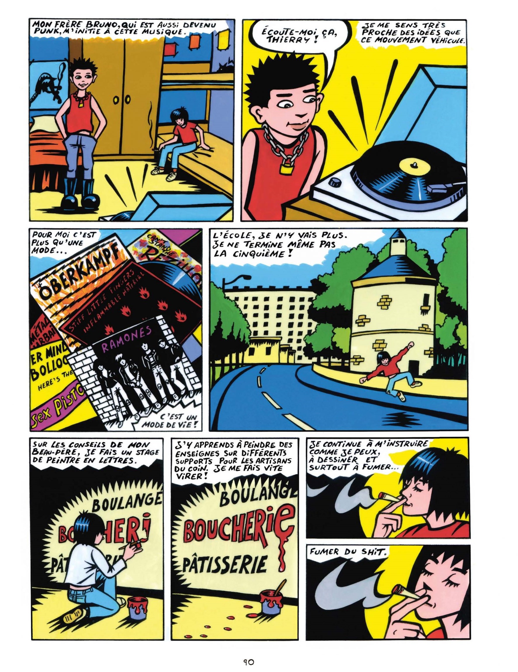 Célèbre illustrateur, graphiste et auteur de bande dessinée, Thierry Guitard emploie un style graphique qui a fait sa renommée et qui incarne (et s’incarne) à merveille dans cette histoire. Son dessin se dirige vers un réalisme schématique et sa ligne, tracée nettement avec précision et rigueur, délimitant clairement les surfaces, lorgne vers la ligne claire, mais avec un trait plus épais, plus lourd et dense à la fois. Les couleurs pop détonnent dans ces images structurées : saturées et souvent réalisées avec des teintes primaires, simples, elles illuminent les planches et s’approchent d’un dynamisme pop. Toutes ces caractéristiques esthétiques détonnent particulièrement avec les évènements racontés : les couleurs rayonnantes apportent une teinte euphorisante (cette caractéristique est d’autant plus flagrante que, pour marquer une période très sombre de sa vie, l’auteur emploie, le temps de plusieurs pages, du noir et blanc soutenu par du gris), alors même que le récit pourrait paraître plutôt sombre voire dramatique. Plus encore, paradigmatique d’une époque, ce dessin déploie une puissance visuelle qui contrecarre la nostalgie qui pourrait se lover dans ce style que d’aucuns pourraient qualifier de suranné ou d’anachronique. Au contraire, l’auteur trouve ici toute la force de sa proposition : il ne tombe ni dans le misérabilisme ni dans le pathos, et installe en parallèle une distance réflexive qui lui assure une narration claire qui rend son témoignage d’autant plus poignant.