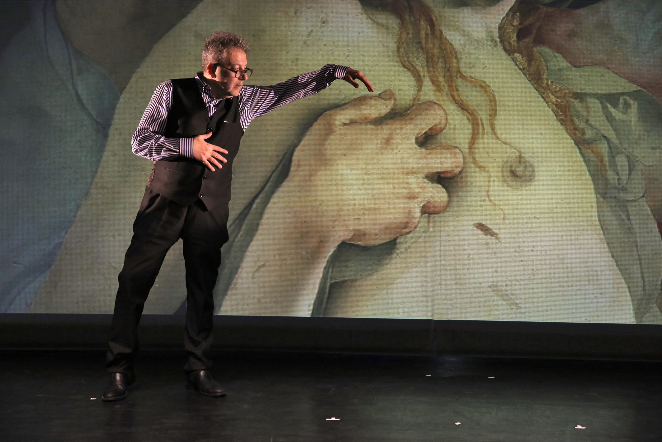 Rien ne semble pouvoir l’arrêter, lorsqu’il s’agit de parler d’art et de peinture. A chaque représentation, le spectateur le découvre d’emblée emporté, passionné, mais n’affichant jamais un ton ostentatoire dans ses analyses. Bien au contraire, le propos s’accommode d’une forme de vulgarisation dissimulée, qui captive le spectateur.