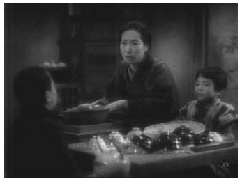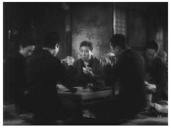 Hataraku ikka (Naruse 1939)Ce film hivernal mais chaleureux avance comme en sourdine, presque sans progression dramatique mais par accumulation de petites scènes ponctuées par des plans de la pendule ou de la ruelle où passe tantôt le veilleur de nuit avec sa lanterne, tantôt les passants courant sous la pluie : les enfants jouent à la guerre en bande dans un terrain vague ; un autre tout seul dans une cour d’école vide ; on ne cesse de se réunir , à la maison ou au café, autour des tuyaux de poêles sans quitter son manteau pour tenir des conciliabules presque entièrement muets.