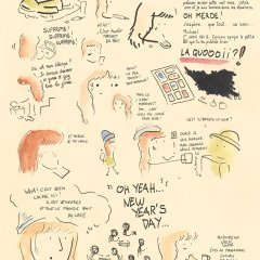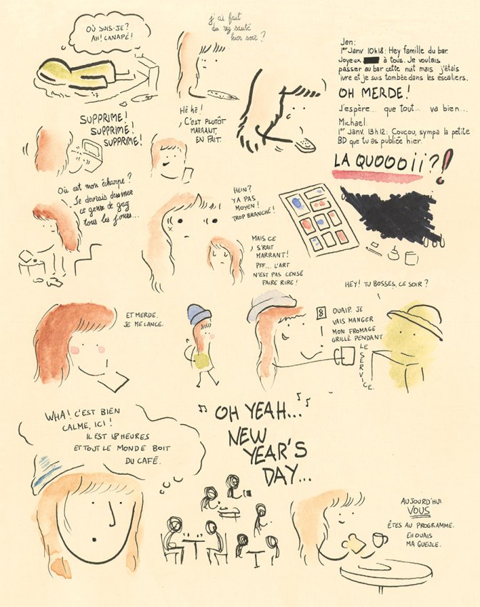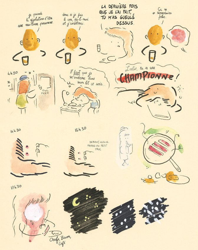 Sans proposer un roman graphique ou un journal à part entière, Leslie Stein a compris que son salut passait par une veine graphique originale, mêlant les couleurs de Bic, les aquarelles et les feutres dans un style parfois léger, mais toujours juste. Si l’on a l’impression de tomber dans les mémoires d’une collégienne, c’est parce que c’est un peu le cas, avec des passages fleur bleu où justement pourraient apparaître des fleurs bleues, tandis que les visages rougissent devant un garçon sympa ou un cocktail alcoolisé. Jamais vulgaires ou exubérantes, ces pages représentent ce qu’Instagram aurait dû être : quelque chose d’intime mais sans trop dévoiler, un lieu plus feutré qu’exhibé.