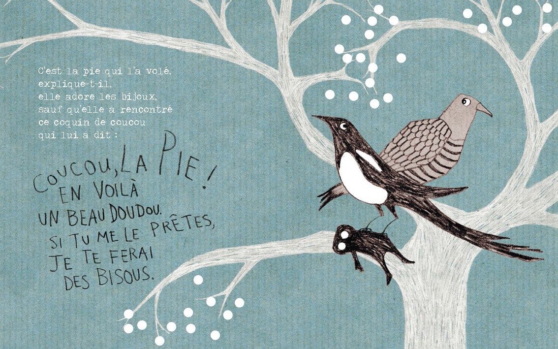 Avertissement : dans cet ouvrage, un Coucou essaie de soudoyer une pie en lui promettant des bisous …
