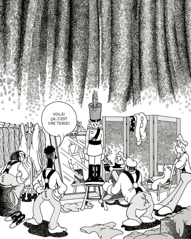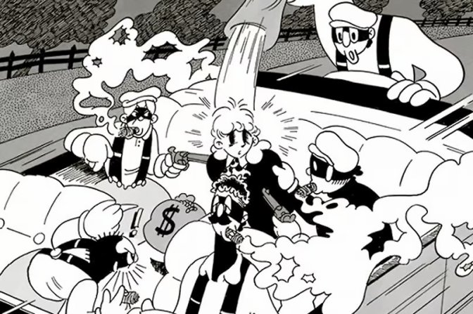 Ce contraste se retrouve aussi dans le dessin, avec la rondeur des formes et les allures cartoonesques et caricaturales des personnages. Le cousin Alain, petit moustachu, rappelle Yosemite Sam ; le shérif rouquin est rageur ; un autre évoque Dingo avec ses membres désarticulés et élastiques ; et puis il y a le plus jeune, un garçon au regard cabotin. Les noms sont farfelus, intrigants : Claudine, par exemple, prénom féminin pour un personnage qui se présente comme masculin et dont on ne connaîtra jamais le sexe.