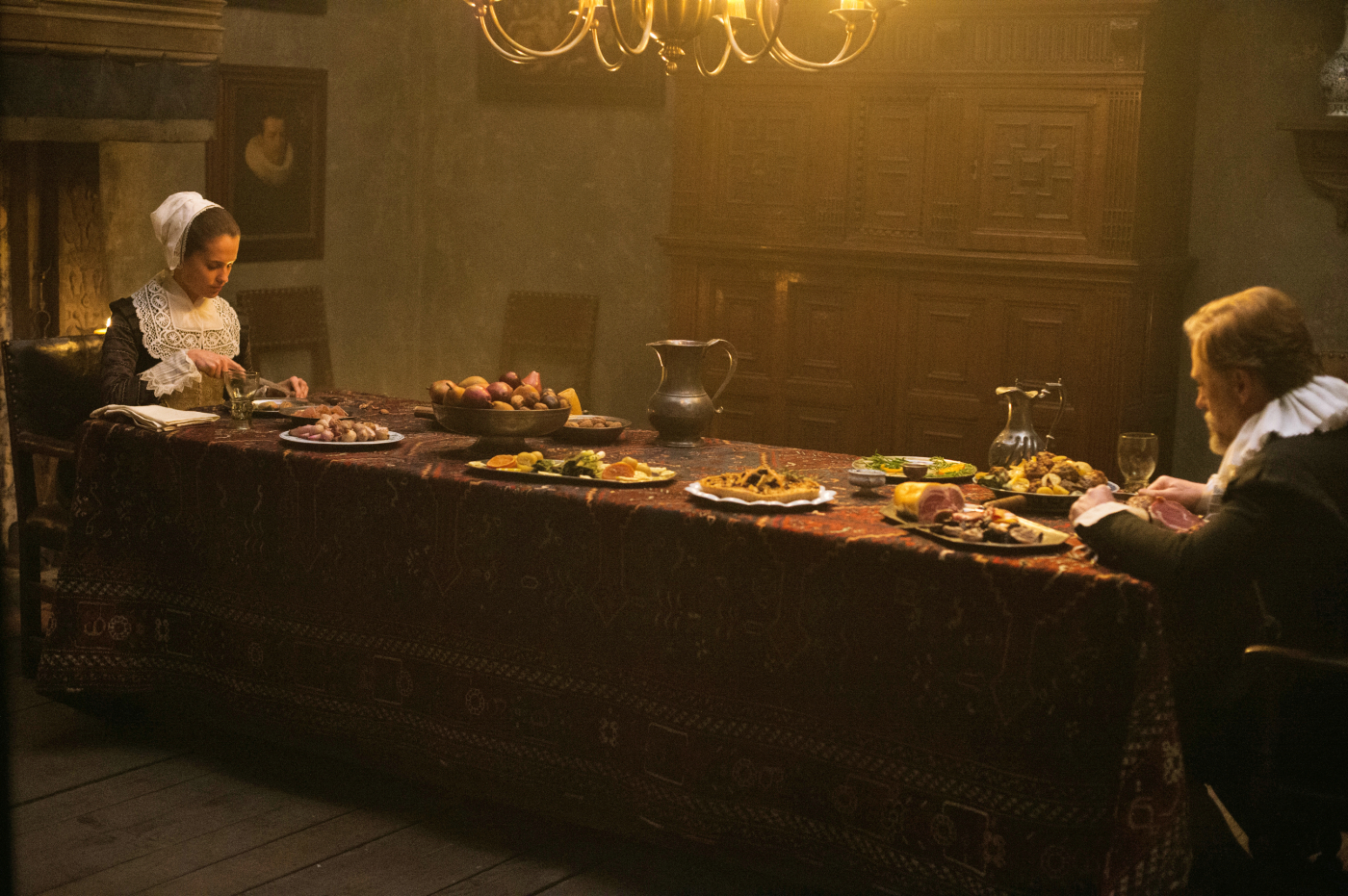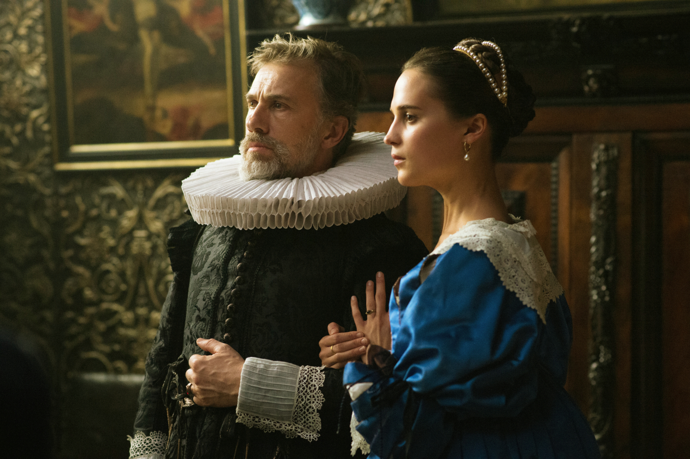 Le tableau est en effet bien fade : un riche commerçant d’Amsterdam a épousé une femme beaucoup plus jeune que lui, qui ne parvient pas à lui donner d’enfant. Sa vanité le conduit à embaucher un peintre pour réaliser son portrait, ce qui conduit la douce épouse et l’artiste à tomber amoureux, sous les yeux de leur domestique. Elle est riche, il est pauvre. Elle est mariée, lui non. L’impression de déjà-vu n’est pas fortuite, surplombée qui plus est par certains clichés assez grossiers. Ainsi, les riches ont une aisance matérielle mais ne sont pas heureux, alors que les pauvres ont des difficultés financières mais un quotidien bien plus réjouissant. Pire encore, pour mettre en valeur la vie terne des commerçants, le couple formé par Christopher Waltz et Alicia Vikander est sans cesse dans l’ombre alors qu’un filtre lumineux entoure Holliday Grainger, qui n’a ici aucun mal à éclipser un premier rôle tenu par une actrice oscarisée qui a l’air complètement perdue. Si Christopher Waltz n’apportait pas toute sa tendresse au mari bafoué, la froideur de l’interprétation laisserait de marbre un public déjà bien ennuyé par une intrigue vue et revue.