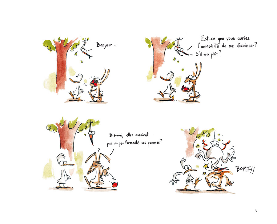 La simplicité donc, est le deuxième élément fort pour l’auteur, qui sait saisir en peu de traits la situation comique. Ainsi le lapin a bien des longues oreilles, le cochon un teint rose, le canard un bec bien pendu, mais tous se déclinent avec des yeux rondouillards, tantôt énervés tantôt hagards, et les corps tiennent en deux coups de pinceaux. De même, le lieu, qu’il soit de la forêt étoilée ou d’un avion détourné, sert de décor presque théâtral, paraissant peut-être bâclé, mais encore une fois dans un souci de simplicité qui prête toujours à sourire pour le lecteur.