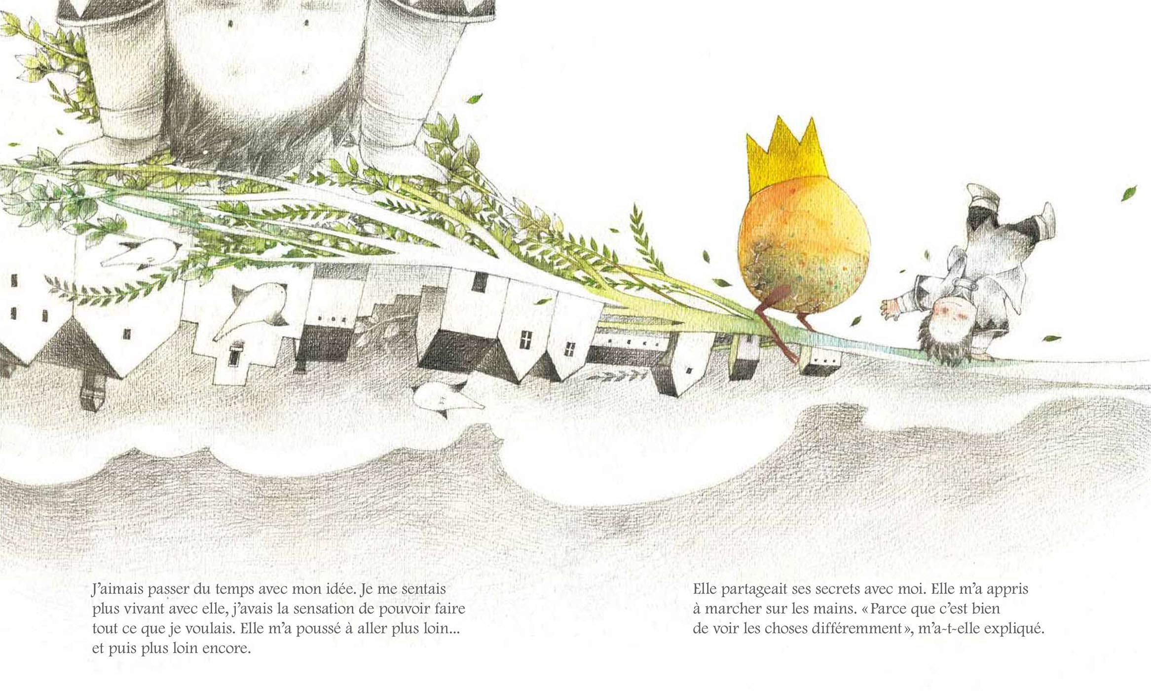 Critique : Kobi Yamada et Mae Besom nous entraînent dans un récit initiatique où un enfant découvre la force introspective d’une idée. La métaphore entre l’œuf et cette émanation spirituelle soudaine, cette action abstraite de la pensée qui survient on ne sait comment, représente tout l’aspect fécond et virtuel de cette notion. C’est une belle personnification d’une chose impalpable qui peuple nos vies, qui nous habite et demeure un véritable mystère, dont le premier n’apparaît pas ici : d’où viennent nos idées ? Les auteurs souhaitent ici approfondir une autre approche : que fait-on avec une idée ? Celle-ci suit le protagoniste et grossit progressivement, se renforce inéluctablement au fur et à mesure qu’il l’évalue aux commentaires des autres personnes, à leur désapprobation, et à son acceptation personnelle et intime de ce qui le meut. Cette histoire et son développement formulent une très belle conception de la portée salvatrice de la confiance en soi et de l’intégrité : c’est en croyant en son idée et en la déployant que le petit garçon pare le monde de couleurs et qu’il en devient le roi.