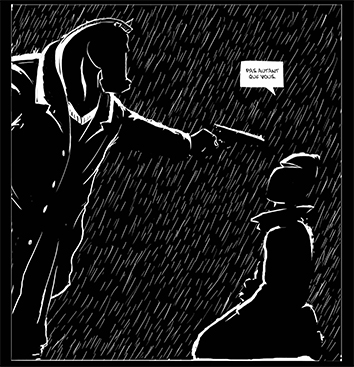 Nous trouvons que ces deux capacités ont été utilisées à bon escient et de manière réfléchie. Même si, concernant les gifs, à notre avis, il y aurait moyen d’améliorer encore leur utilisation. Comme la pluie battante, un très bel effet, mais qui n’est utilisé que dans certaines cases ou qui se cumulent parfois avec le dessin de la pluie sur la case. Et là, nous sortons de la lecture, en nous demandant comment se justifient narrativement ces choix.