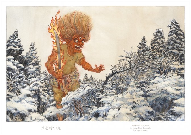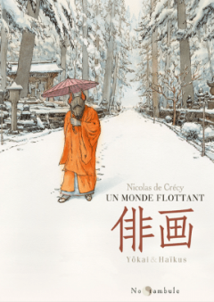 Il y a certaines œuvres inclassables : ni manga, ni BD, ni recueil de poésie, mais un mélange artistique, une création. Nicolas de Crécy a créé une œuvre qui est un hommage vibrant à la culture japonaise. Un monde flottant associe en effet l’haïku, ce poème court, ironique ou romantique, aux yôkai, esprits souvent monstrueux qui parsèment le quotidien des japonais. Deux éléments très traditionnels qui forment une œuvre finalement très moderne. En effet, les textes et dessins sont très liés à la société contemporaine, urbaine et consommatrice. C’est une réflexion à la fois très explicite dans les représentations des divinités dans des environnements actuels, et très implicite dans les courts vers qui mêlent différents thèmes. De même, pas question de trame scénaristique, pas de planches, mais un déroulé comme un parchemin, lisible dans les deux sens, marquent ce dédoublement occidental-oriental, ce contraste entre des monstres d’avant Edo et des buildings du nouveau Tokyo.