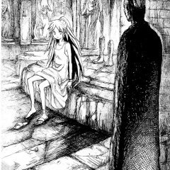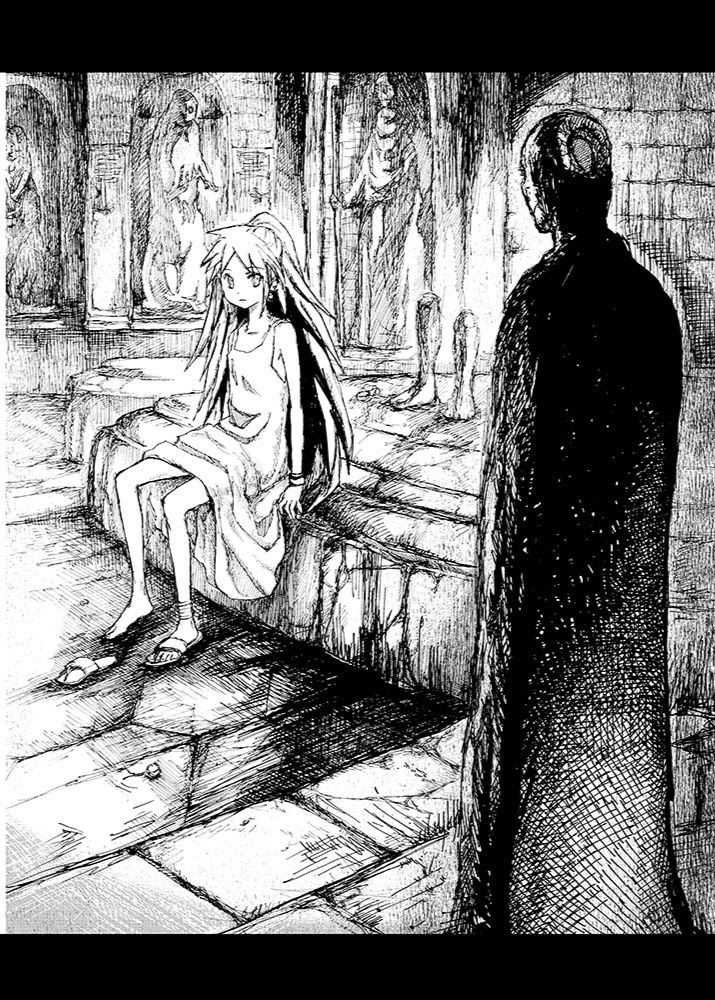Nous suivons d’abord Ezline avant de passer du point de vue de Puryo, l’apprentie grande prêtresse. Par son regard, nous découvrons ce monde curieux et religieux, et aussi ce temple et ses tonnes de mystère. Ce manga est d’ailleurs un Seinen basé sur l’intrigue plus que sur l’action. Des tranches de vie, du quotidien, mais du quotidien dans un endroit aux salles secrètes, aux statues qui peuvent parler, aux gardiens joueurs de cartes qui jouent et rejouent sans cesse la même partie ou une partie infinie, qui sait ? Autant dire que sur les cinq chapitres, il se passe peu d’événements forts mais pourtant le récit avance doucement, prenant son temps, et nous laissant celui de parcourir ses pages et de s’imprégner de ce pays. Et sachant que cette courte aventure s’étale sur trois tomes, nous ne sommes pas inquiets de la durée du développement tout en douceur d’une intrigue plaisante.