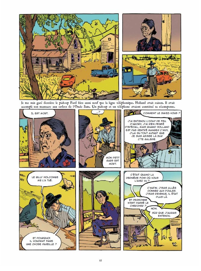 Avec son dessin au trait noir et sa mise en couleur lumineuse, Michele Foletti parvient à capter l’esprit de cette campagne pauvre et matraquée par le soleil, où les récoltes sont maigres et les habitants superstitieux, comme le démontre la légende noire qui entoure « l’accoucheuse » vivant au fond des bois. Les dernières pages du récit sont, à cet égard, très révélatrices de l’esprit de ce pan de l’Amérique.