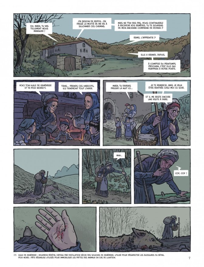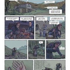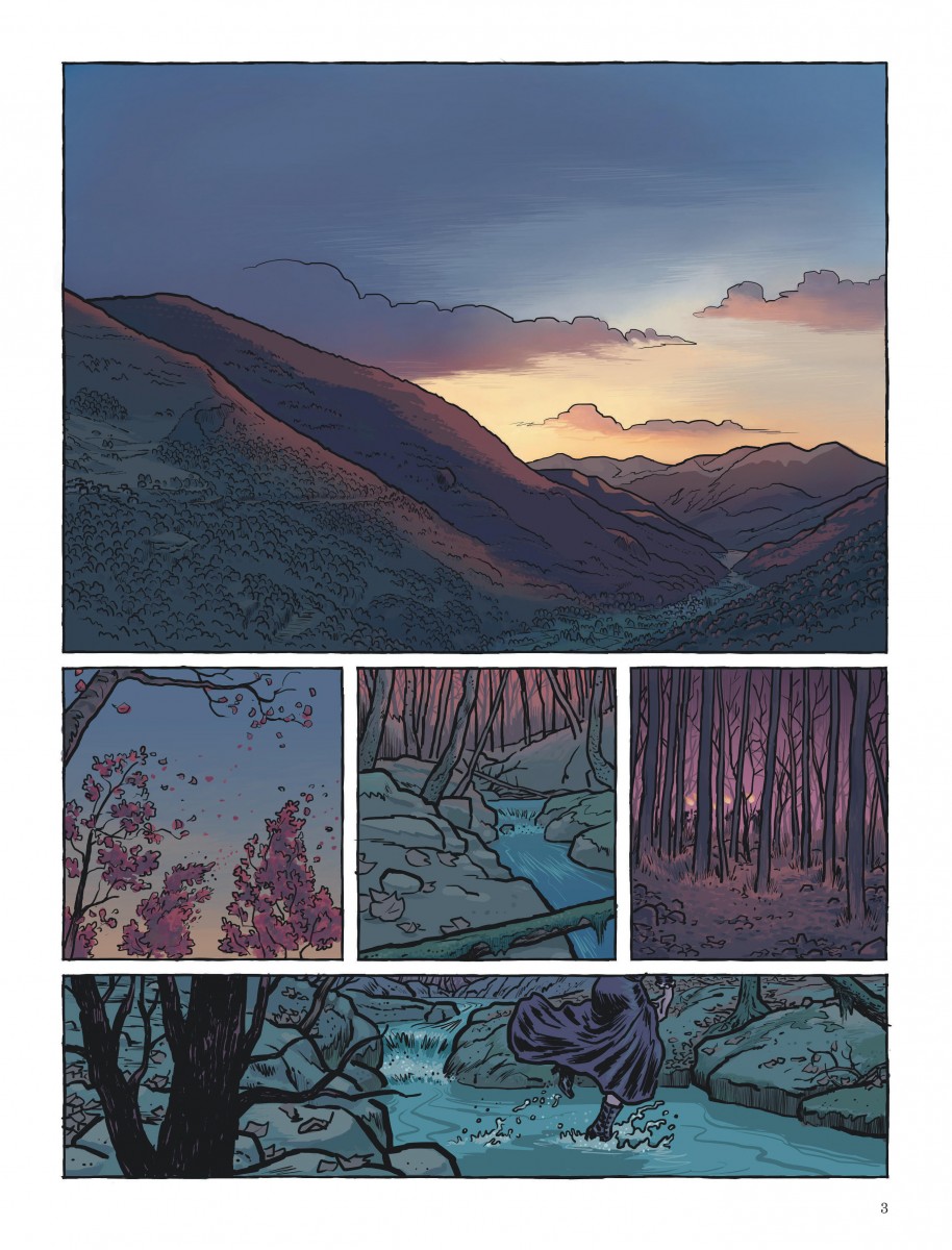 Pour évoquer ces Pyrénées entre paysage sublime et nature hostile, le dessin a plutôt tranché en faveur de ce second aspect. Les pages font la part belle aux rochers escarpés et grisâtres, avec des arbres noueux et trop humides pour un bon feu, avec des bories de bergers, des masures rustiques et des sentiers boueux, autant d’éléments qui donnent une ambiance terne comme si, à l’image du titre, un sombre manteau avait recouvert des montagnes qui n’ont pas ici le vert fabuleux et le ciel bleu d’un roman de George Sand. Non, il s’agit ici bien de vivre entre ces flancs rocheux, inhospitaliers pour celle ou celui qui les connait, mais les a seulement un peu amadoué, et les gens qui se frottent à cet environnement tendent à devenir comme lui : à la vision de cette belle dame venue de la ville, les autres jeunes femmes se plaignent et le montrent d’ailleurs, elles ont les mains calleuses, les cheveux rêches, les vêtements sans lustre. Pourtant, la robe qu’elle portait n’était que d’un noir de funérailles.