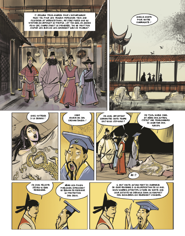 On retrouve ici le juge investigateur, parfois manipulateur, toujours implacable et parfois presque violent dans ces décisions qui bien que justes sont définitives et reflètent les mœurs de l’époque. Il est aussi intéressant de le voir en duo avec sa première femme. C’est en effet elle qui assiste à la mort suspecte et qui met Ti au défi de résoudre l’énigme. Toute aussi pertinente que son illustre époux Madame Première ne manque pas de piquant elle aussi ! Les acolytes indispensables du magistrat complètent le tableau d’une équipe sympathique. On regrettera cependant le format 48 pages qui est un peu court. Le choix de faire un tome unique donne ainsi la sensation que l’enquête est réglée un peu trop vite, un arrière goût expéditif qui ne rend pas honneur au personnage.