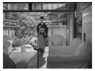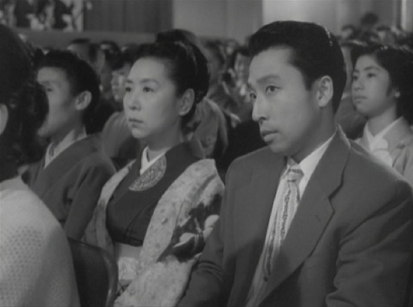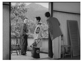 Une scène, entre autres, est exemplaire de ce sens très sûr de la chorégraphie jamais gratuite, totalement au service de la précipitation de l’acmé dramatique et reposant en grande partie sur un maniement exemplaire de la profondeur de champ : celle où la mère, Hatsuko, surprend son amant et sa fille après être sortie de la salle pendant une représentation de Nô (elle ne supportait pas le spectacle d’une vieille femme ridiculisée parce qu’éprise d’un homme plus jeune). Tout s’organise ici autour d’une cloison séparant en deux l’espace du foyer. Même lorsque Hatsuko n’apparaît pas à l’image, cachée derrière la cloison, c’est vers elle que tout converge, mieux, c’est elle que nous voyons.