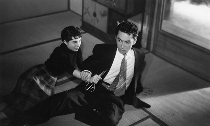 Vue précédemment chez Naruse (Haru no mezame - l’éveil du printemps en 1947) ou Kurosawa (l’intransigeante Ayako de Hakuchi - l’idiot en 1951), Yoshiko Kuga, avec ses cheveux courts, sa spontanéité et son allure décidée, fait de Yukiko, la fille, une jeune femme moderne, entière, révoltée contre cette forme d’esclavagisme et contre la veulerie des hommes en général. La scène où, ayant découvert le double jeu de celui en qui elle avait placé sa confiance, elle se saisit d’une paire de ciseaux est justement célèbre. Son impact repose sur le jeu de l’actrice, dont le visage ne laisse transparaître aucune émotion, et plus encore sur le sens imparable de la mise en scène qui parvient à nous faire voir, dans l’ellipse, un passage à l’acte qui, en fait, sera évité.