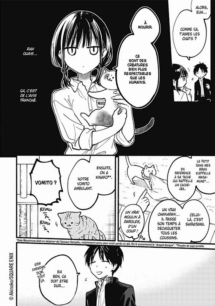 Critique : L’intrigue avance tout doucement, les moments d’éloignement et de rapprochement s’enchaînent entre Seno et Nezokane. Leur entourage commence à remarquer leur rapprochement. Dans cet opus, c’est Kiyomiya qui prend de l’importance, car elle court après Nezokane pour la convaincre de rejoindre le club photo, ce qui donne lieu à des moments très drôles. En effet, les deux jeunes filles sont complètement opposées, Nezokane est introvertie, silencieuse, mais sait dire non quand elle n’a pas envie, et Kiyomiya, super extravertie, ne lâche jamais l’affaire et ne peut s’empêcher de parler. Seno reste à l’écart, convaincu que Nezokane ne cédera jamais. Entre temps, de son côté, il rencontre la patronne du café à chat où travaille Nezokane. Et en échangeant avec elle, il apprend à mieux comprendre celle dont il souhaite devenir l’ami. Ce qui lui donnera l’occasion de rendre un grand service à Nezokane...